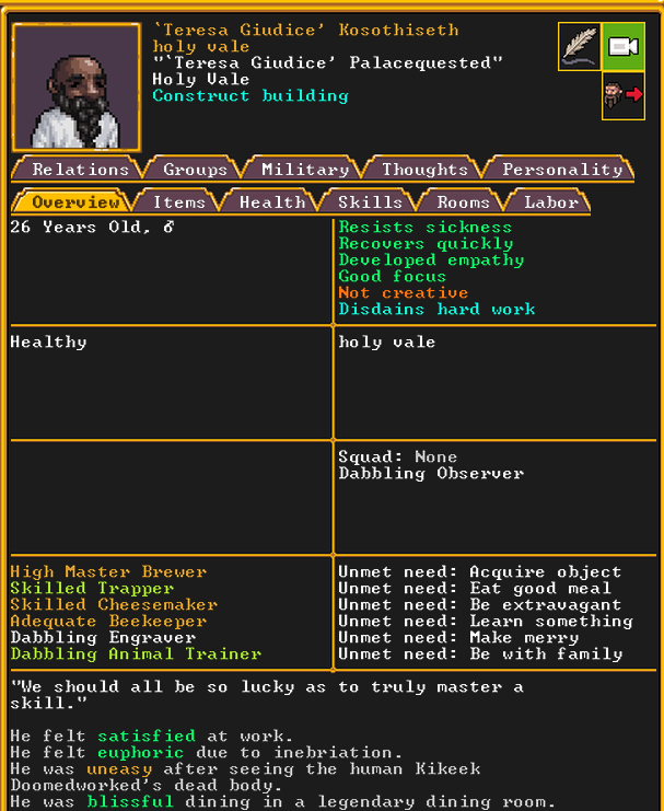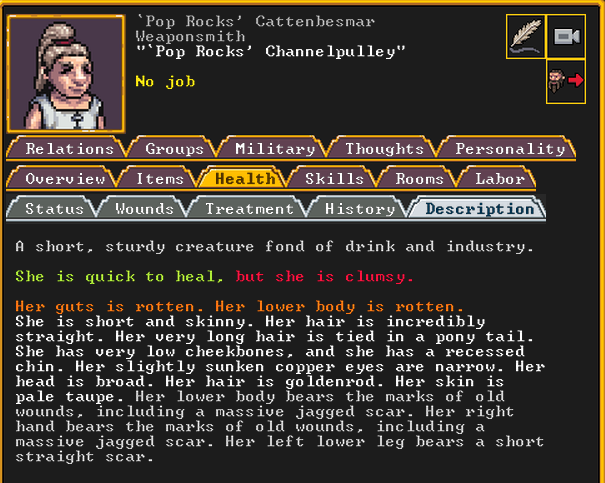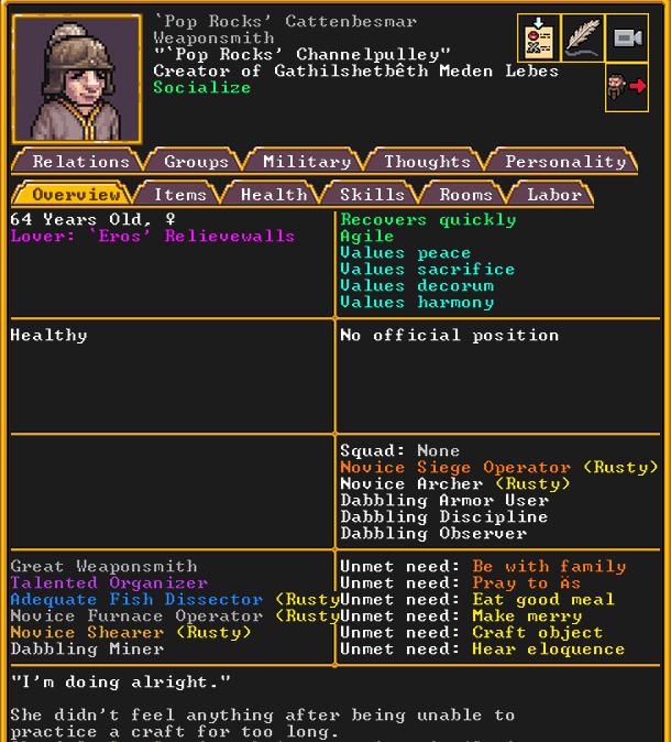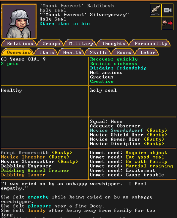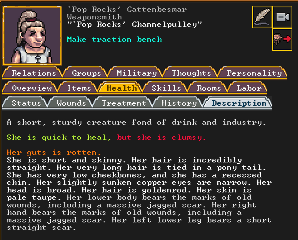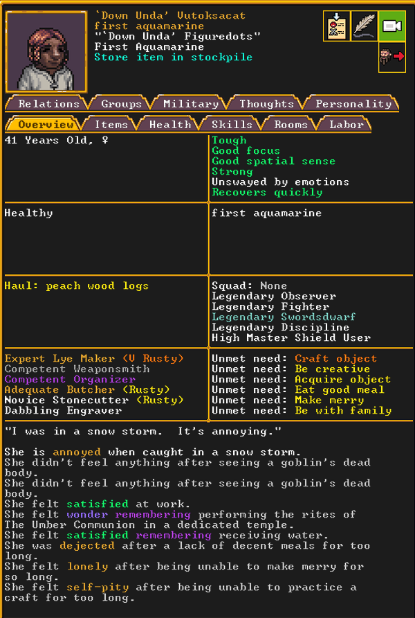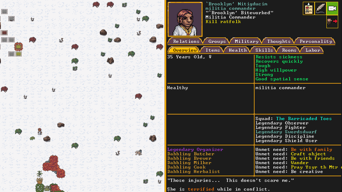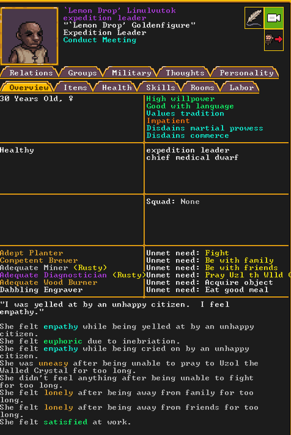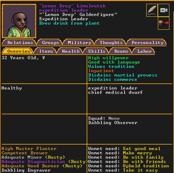 Spring 152: Lemon Drop is serving us well as a kind and empathetic leader. She is an adept planter and a competent brewer, as well as a competent consoler and pacifier. Despite being our chief medical dwarf, she does not have a ton of skills in medical related talents, and is mostly