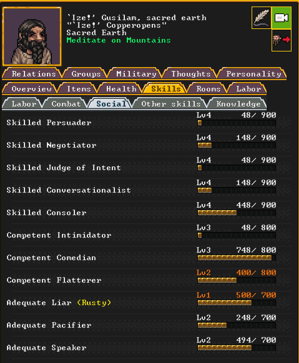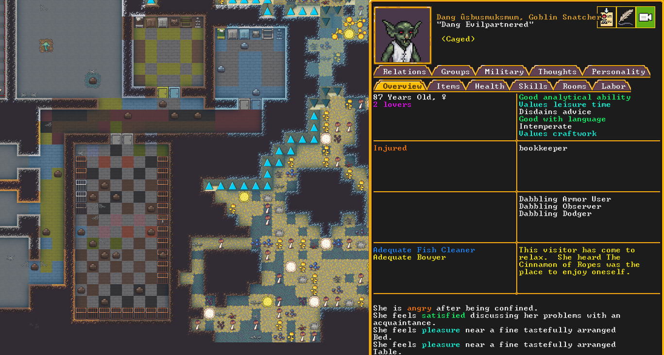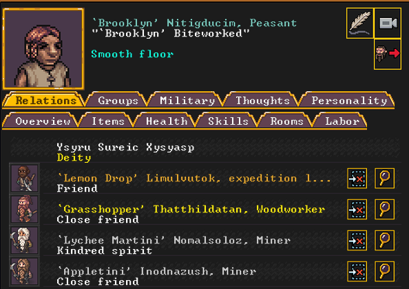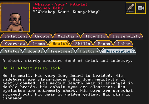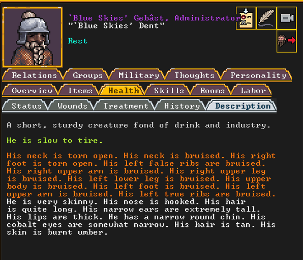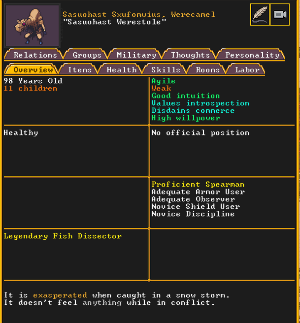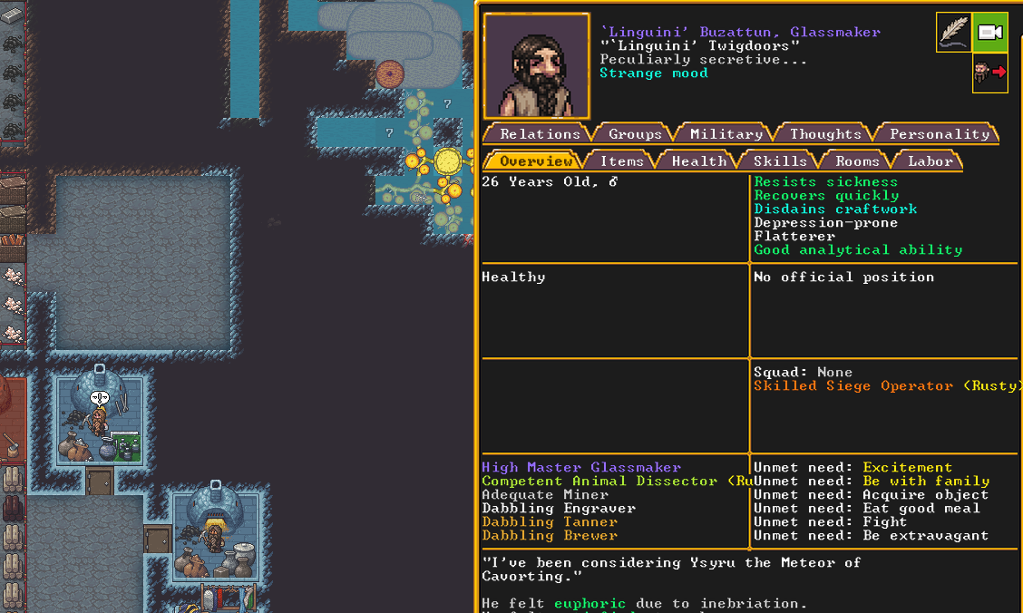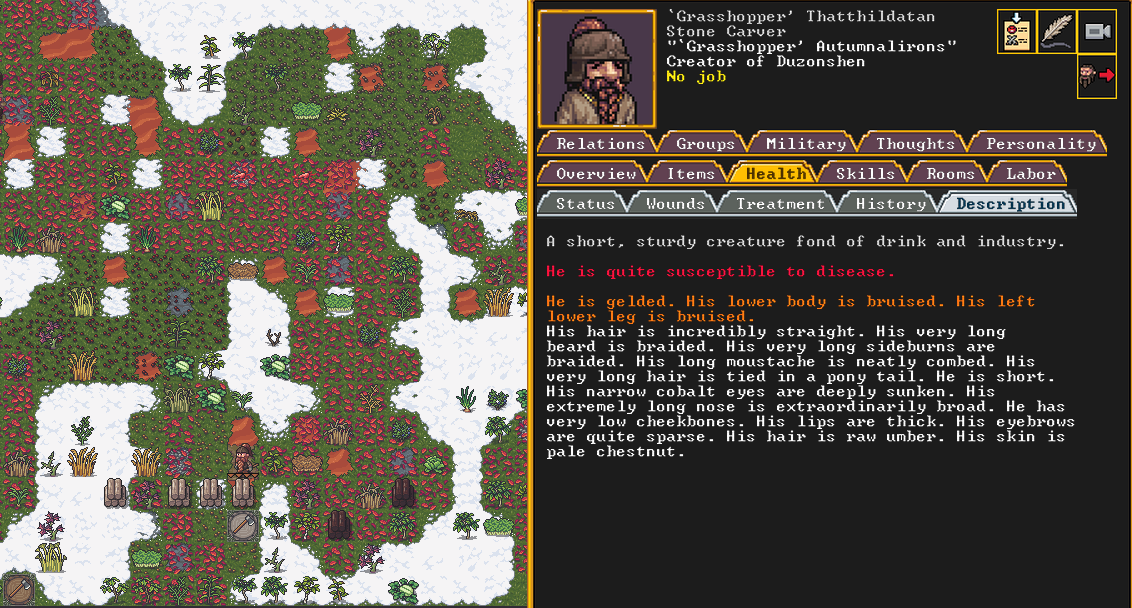 Spring 152: Lemon Drop is serving us well as a kind and empathetic leader. She is an adept planter and a competent brewer, as well as a competent consoler and pacifier. Despite being our chief medical dwarf, she does not have a ton of skills in medical related talents, and is mostly