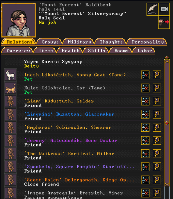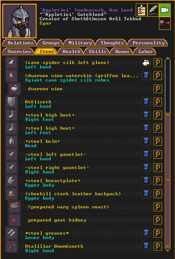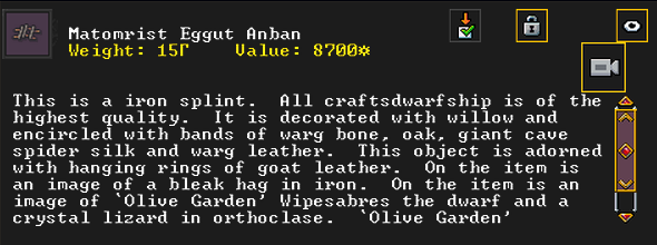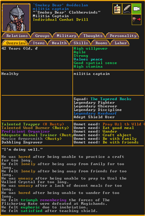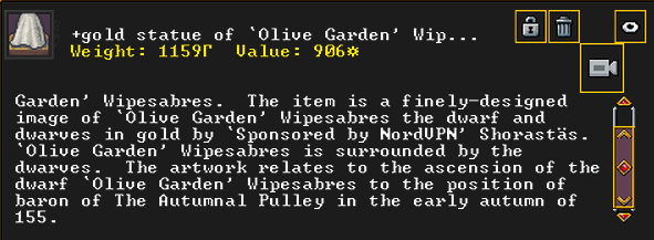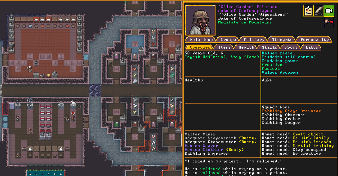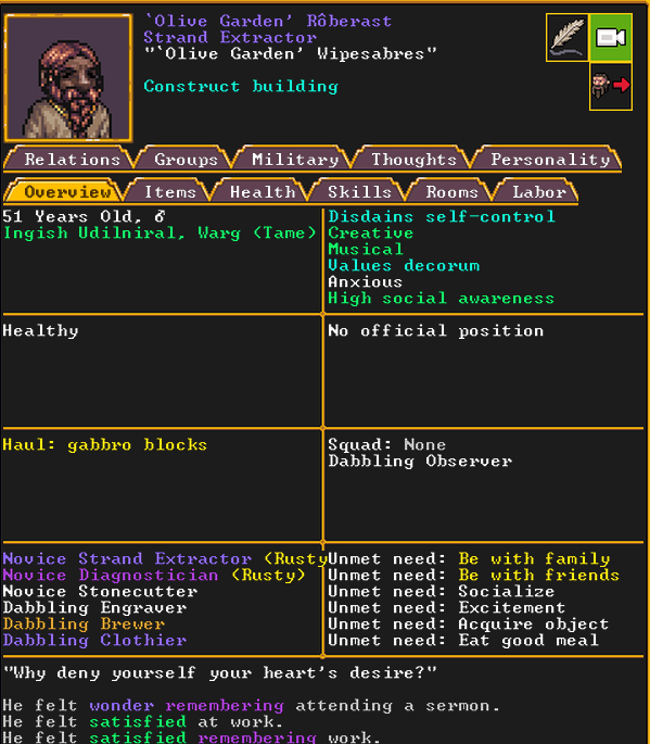 Autumn 155: The dwarven caravan came again, and they demanded to name a noble. We select Olive Garden, a strand extractor, to be elevated to the nobility. Adamantine strands will hopefully be in our future, and this a good omen moving forward. Olive Garden is notable for having a pet warg, a fearsome dog-like beast, but much larger. He has many passing acquaintances, but no true friends, at least not yet. He is religious, and is an ardent follower of Ize! and The Umber Communion, worshipping Uzol the Walled Crystal.