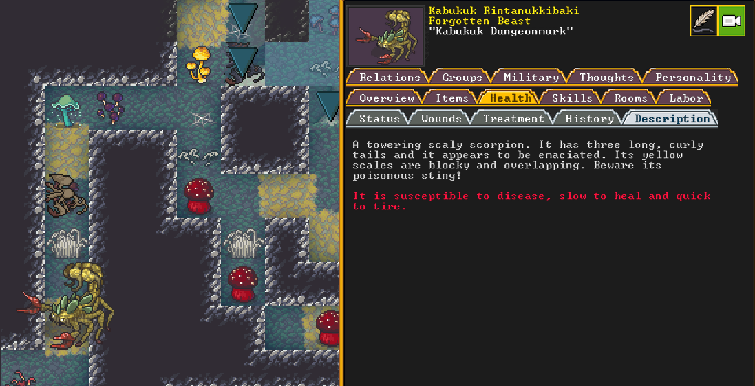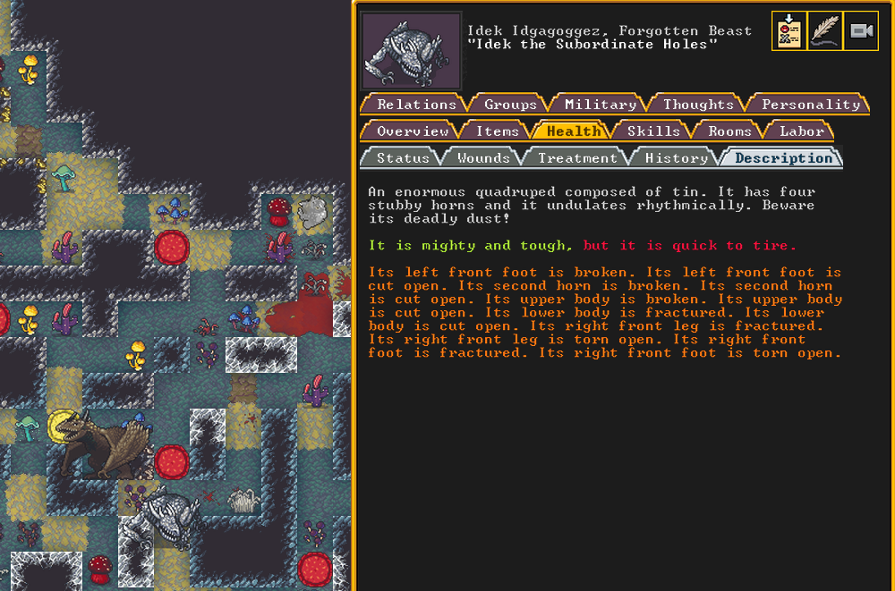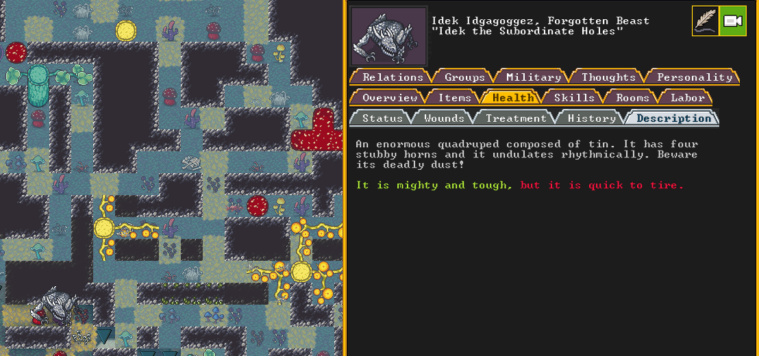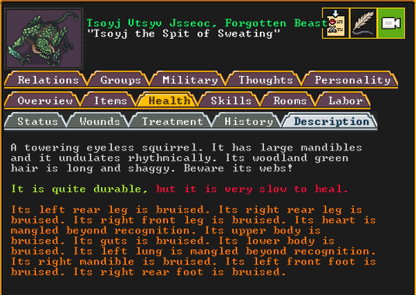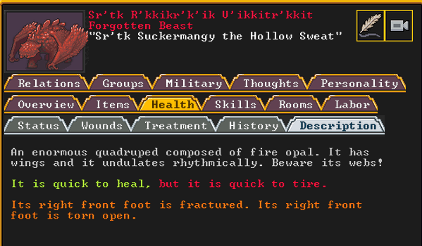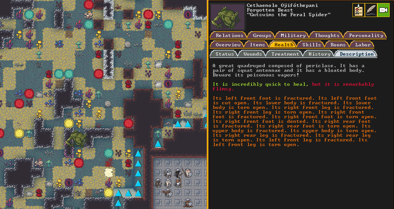Autumn 160: The first attacker comes quickly, and he may be the most threatening of the bunch. Named Gutswims the Feral Spider, they are a gigantic quadruped composed of periclase, a tough stone. They have a poisonous vapor attack, and given our lack of a library, we do not have an easy way to research what that may be, or if there is an antivenom of sorts that can neutralize it. Thankfully, Captain America and our marksdwarves manage to kill it at range.