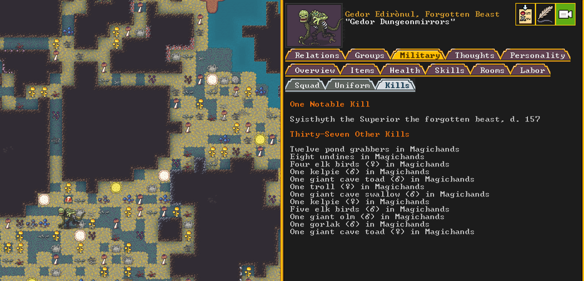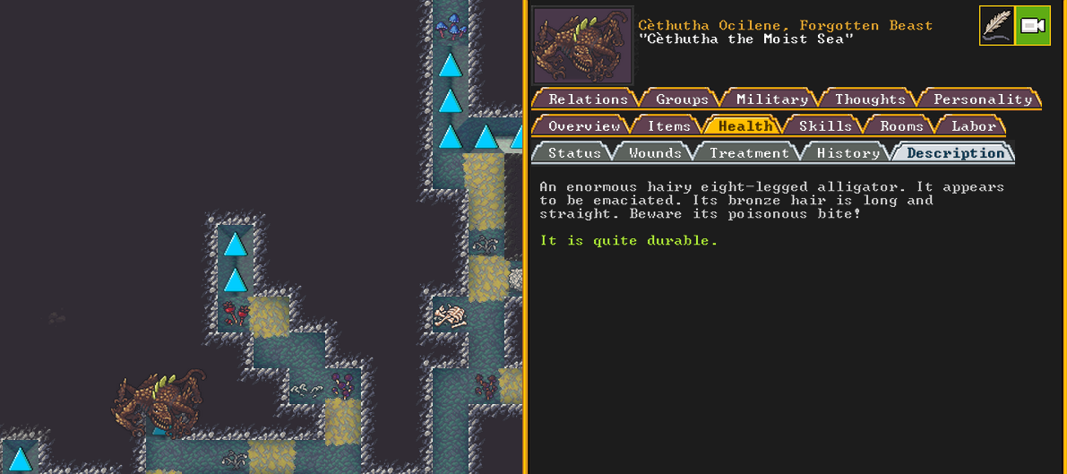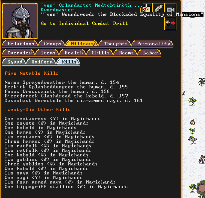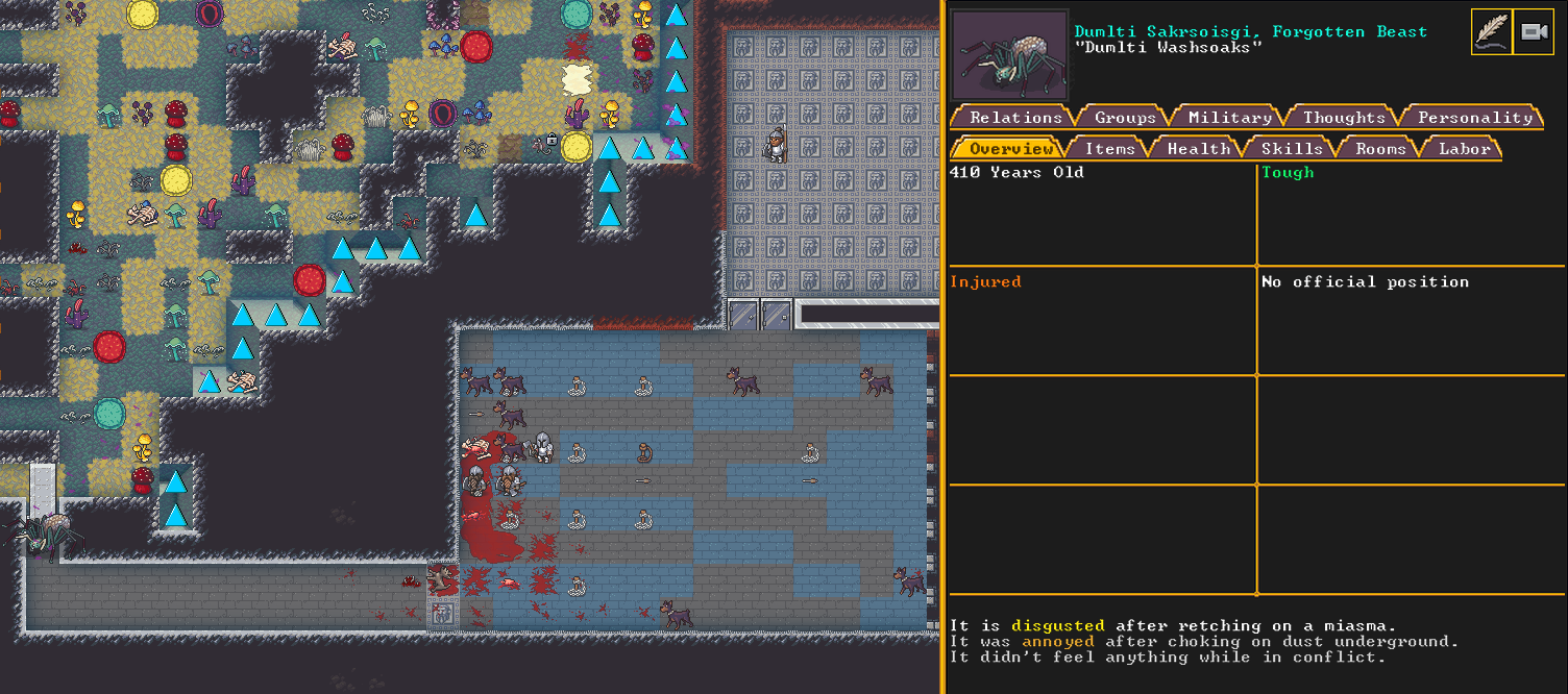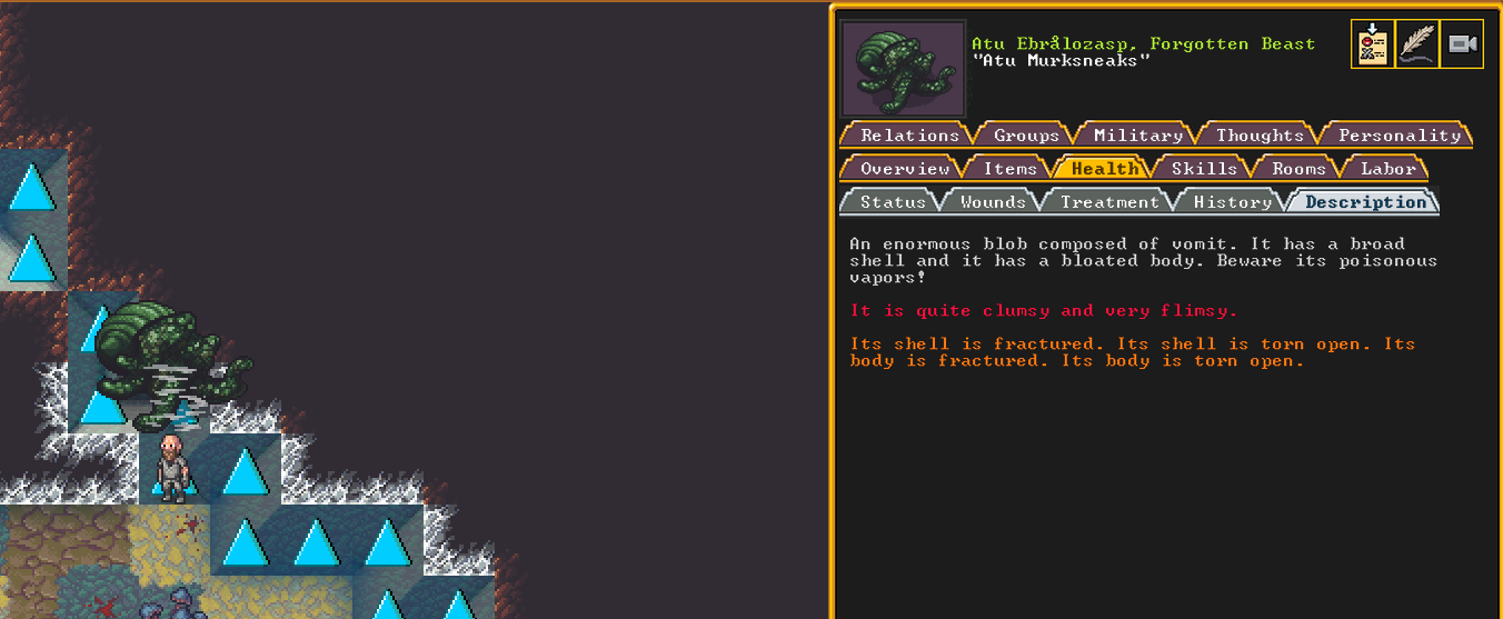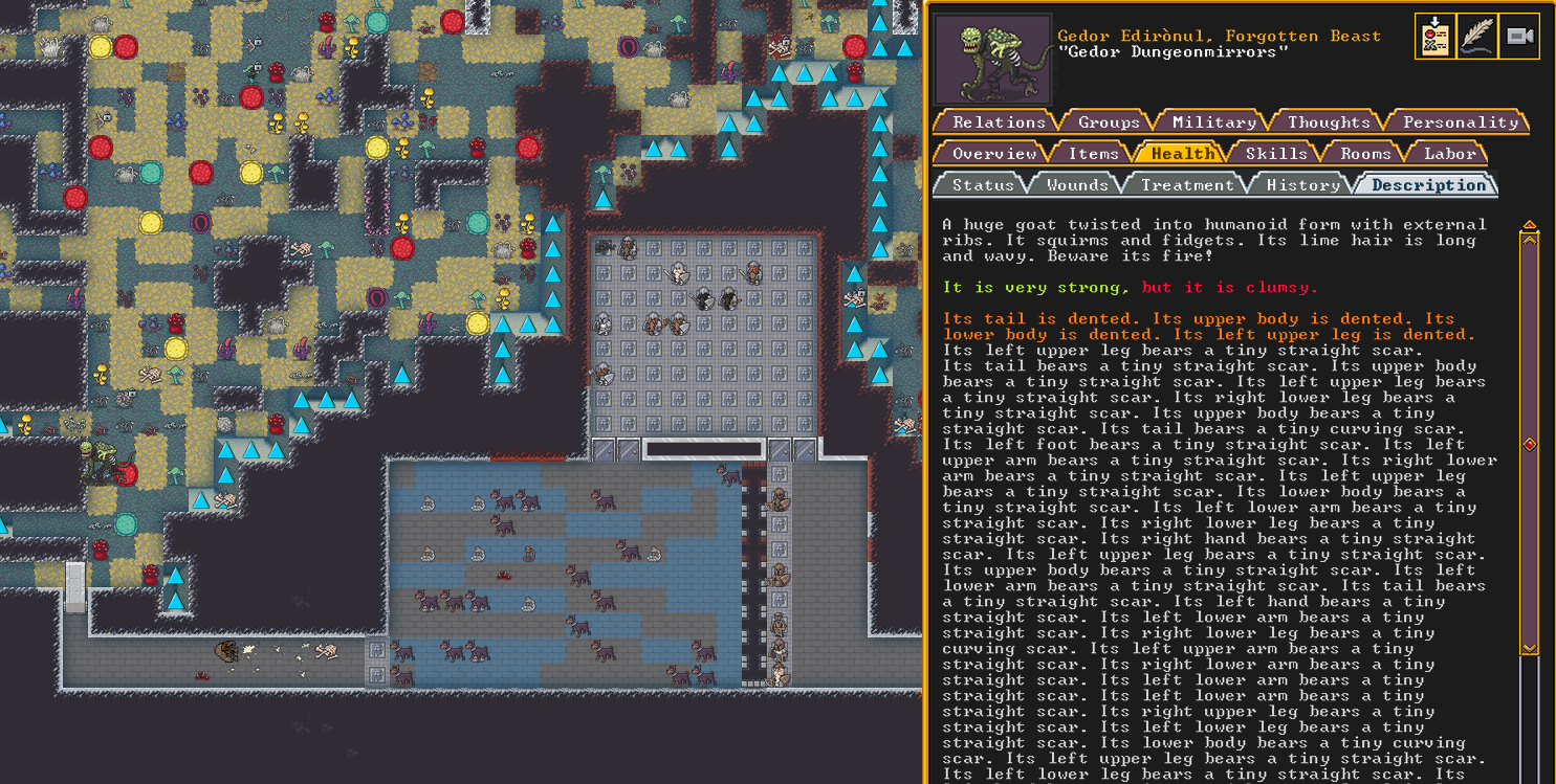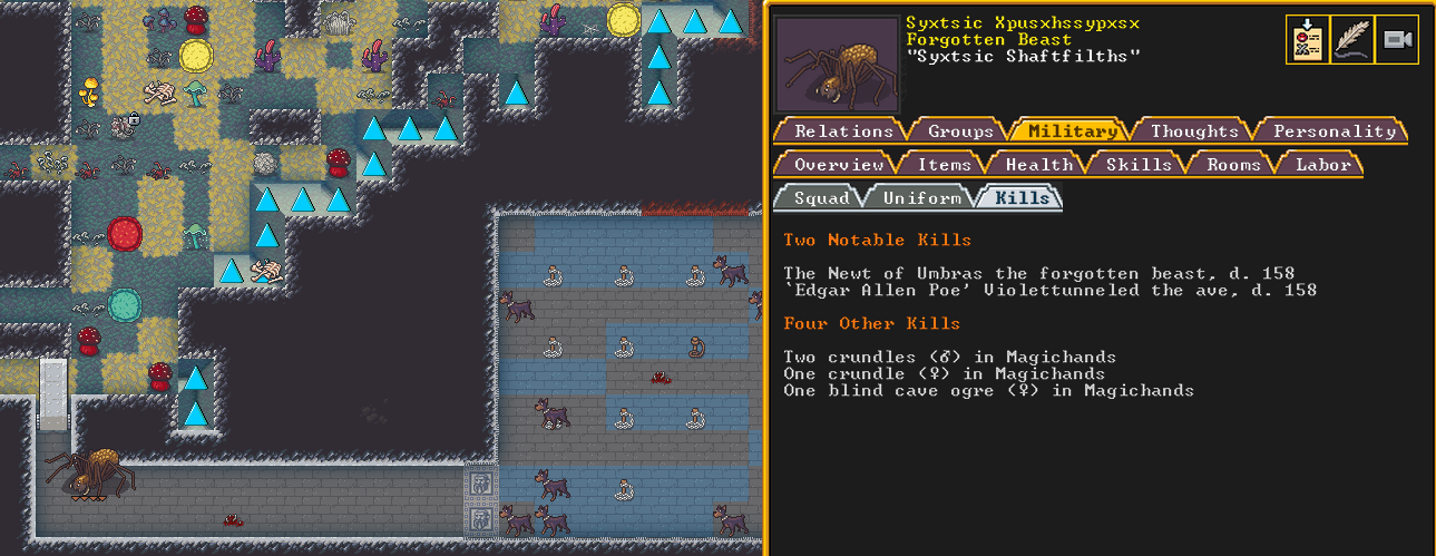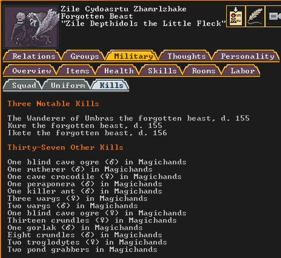 Summer 161: Ultimately, our melee squad had to deal with him. Ven, the swordmaster, gets the kill, and this is their fifth notable kill! He gains the title “The Blockaded Equality of Mansions”. He is the first melee dwarf to get a title in our fortress!