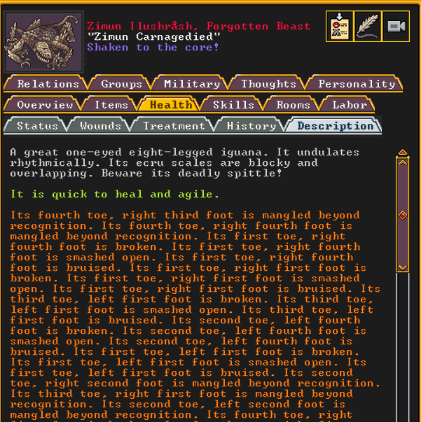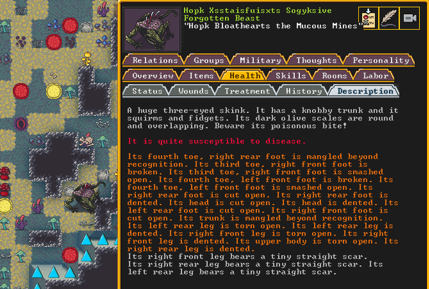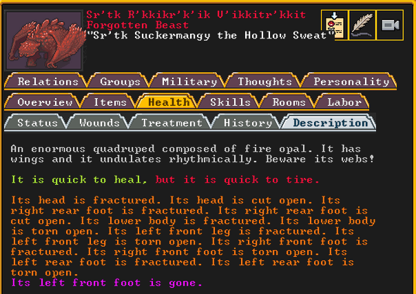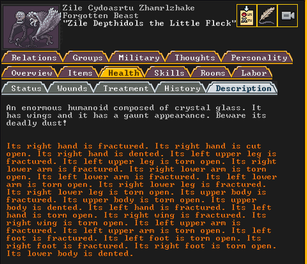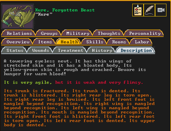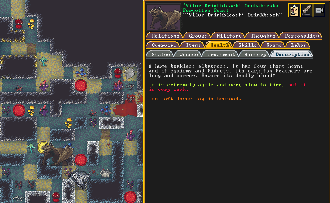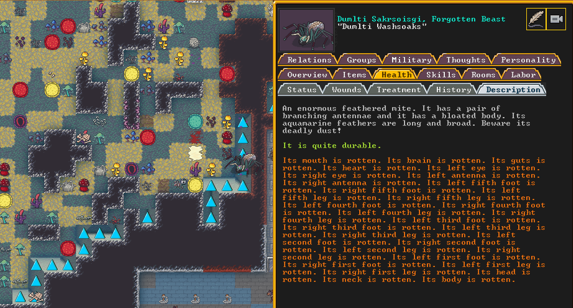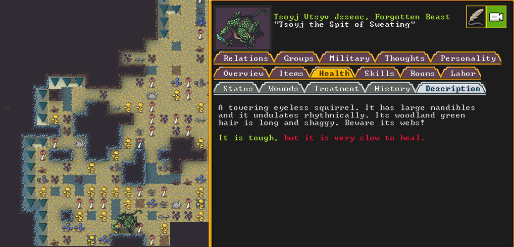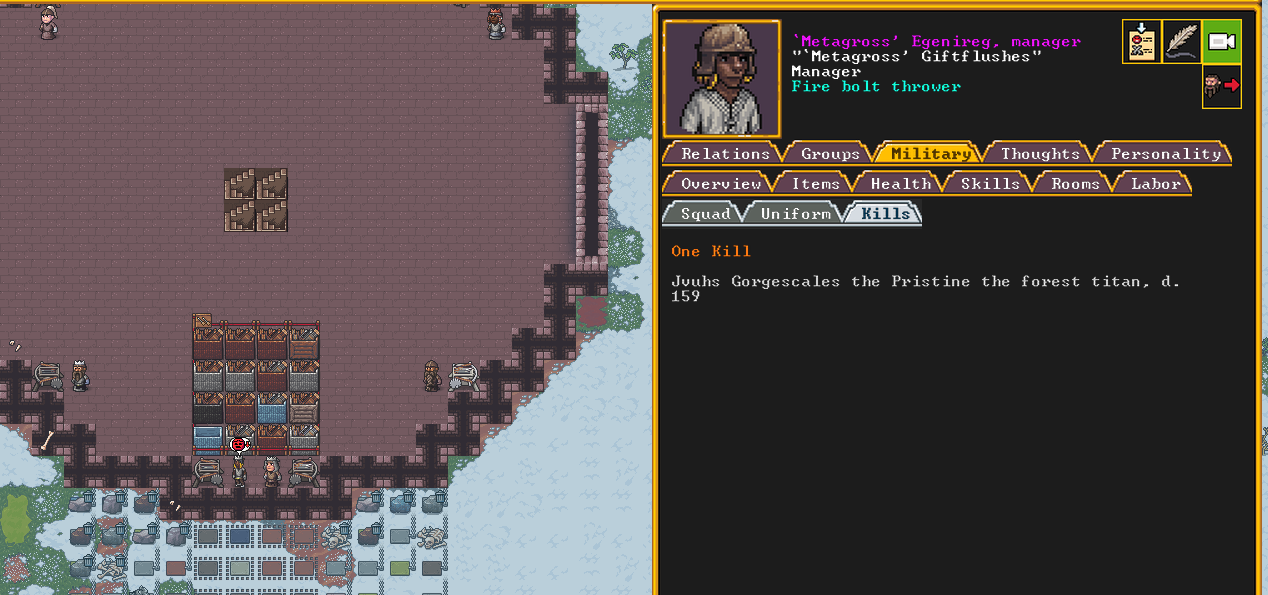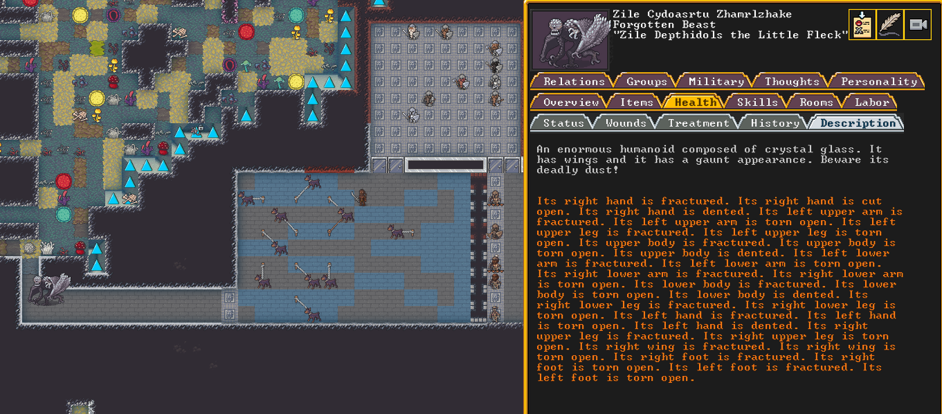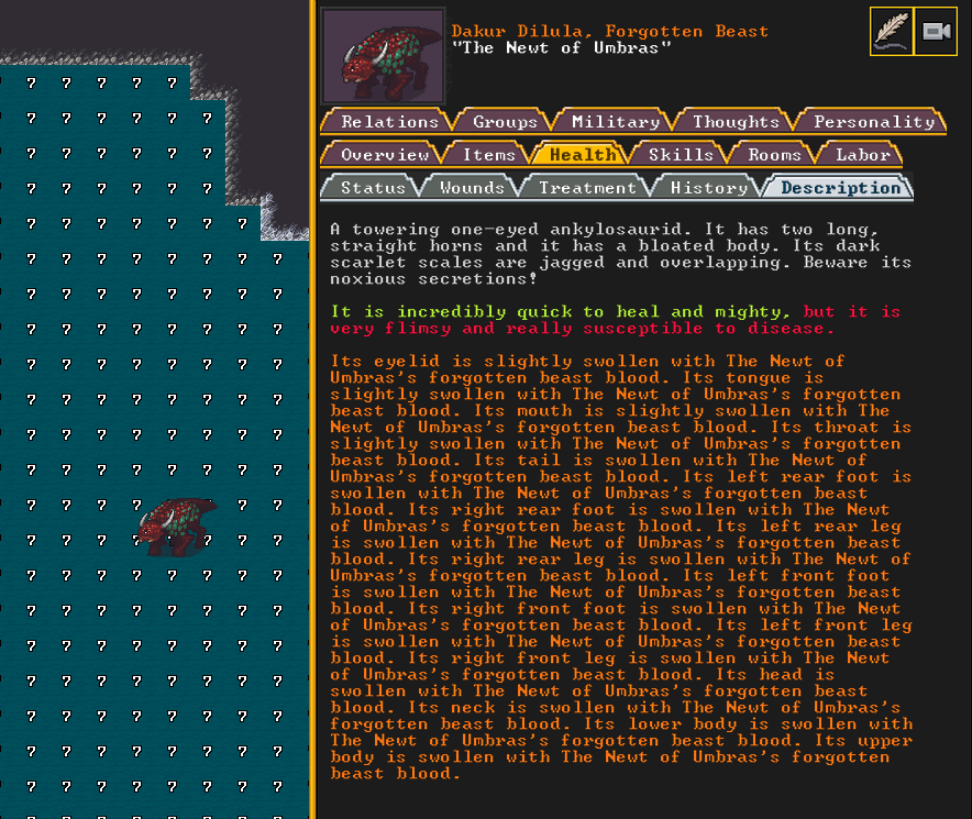 Summer 161: Ultimately, our melee squad had to deal with him. Ven, the swordmaster, gets the kill, and this is their fifth notable kill! He gains the title “The Blockaded Equality of Mansions”. He is the first melee dwarf to get a title in our fortress!