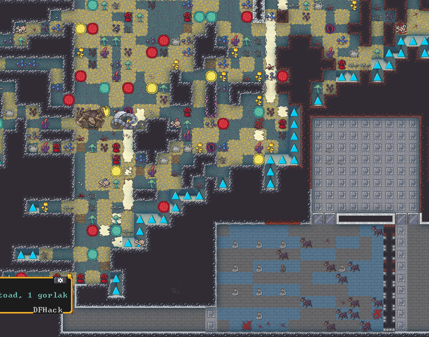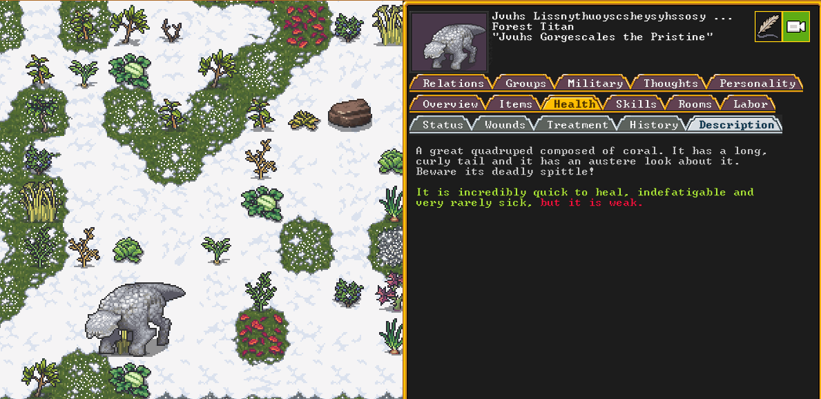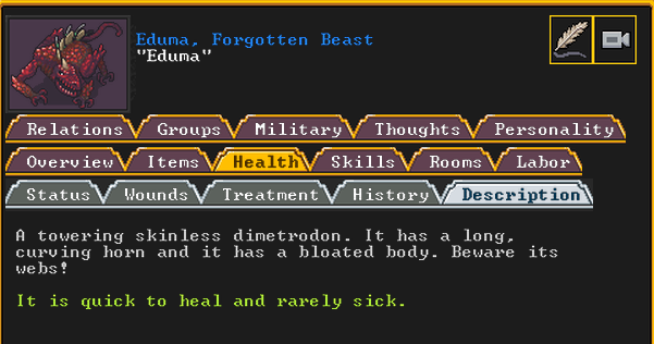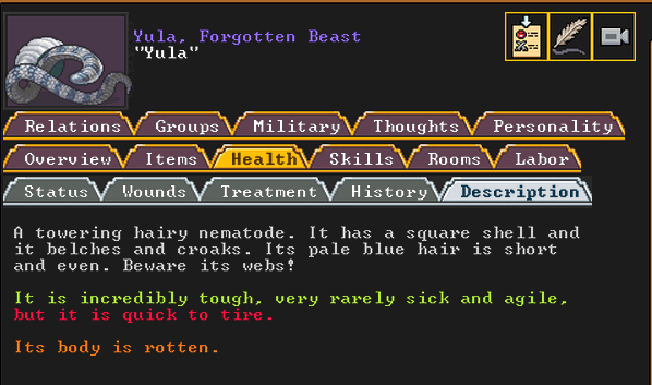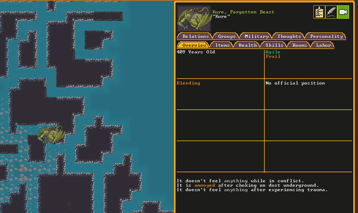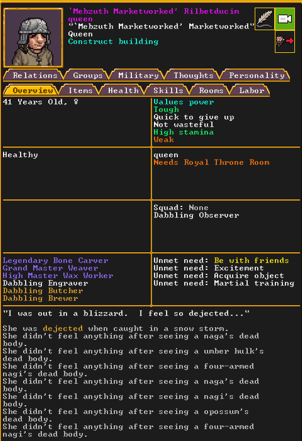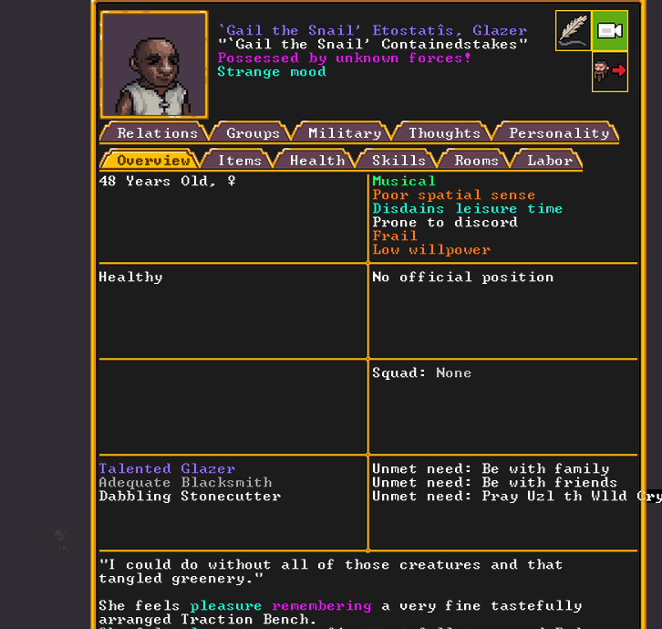 Spring 152: Our first possession has occurred! Gail the Snail was possessed. She claims a metalsmith forge. She is a talented glazer who recently immigrated to our fortress, and is also an adequate blacksmith. Hopefully she makes something awesome!