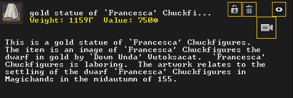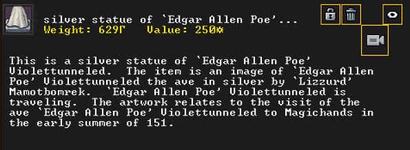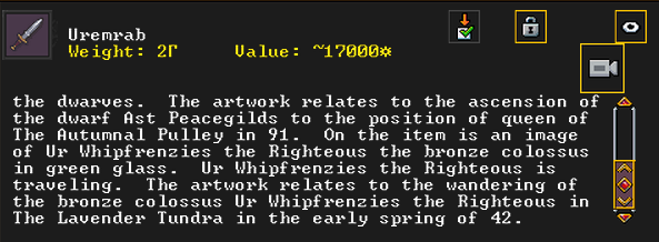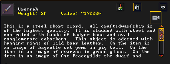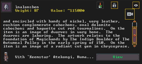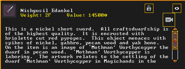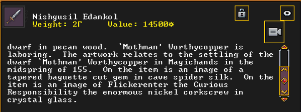 Summer 160: The Apprentice, a thresher, was inspired and created Nishgusil Edankol (Tradedcopper the Stirred Wheel), a nickel short sword artifact. It depicts the settling of the dwarf Mothman in Magichands in the midspring of 155. It also has an image of Flickerenter the Curious Responsibility to enormous nickel corkscrew artifact on it.