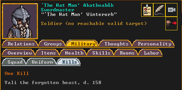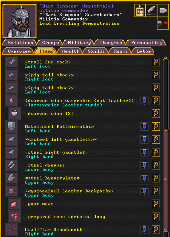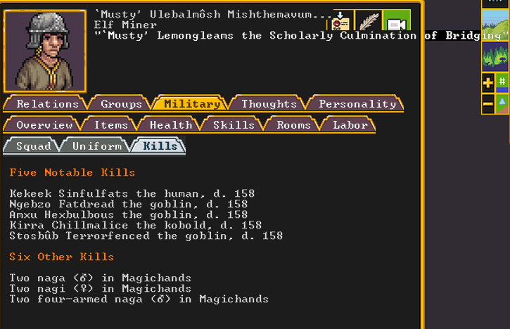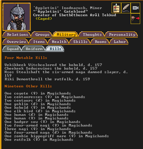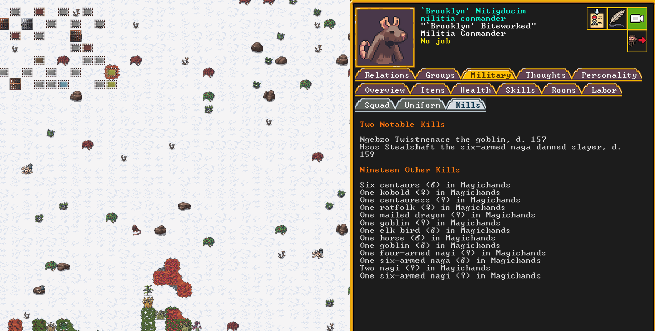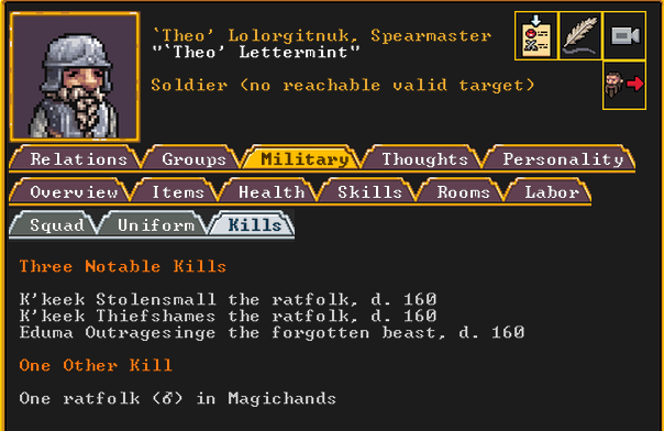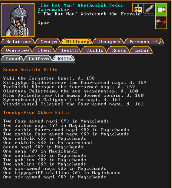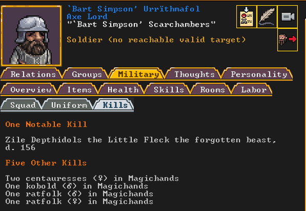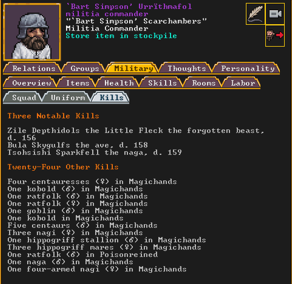 Autumn 161: Lisa Simpson, a kobold poet, was caught up by the horde and killed. Our second militia captain, Big Head Man, is leader of the reserve forces as punishment for stealing. He is a proficient swordsdwarf now. He wields the legendary artifact blade Nishgusil Edankol (Tradedcopper the Stirred Wheel).