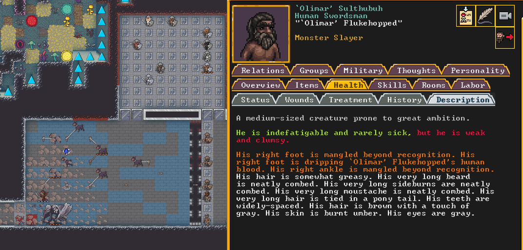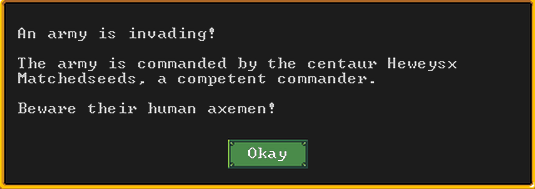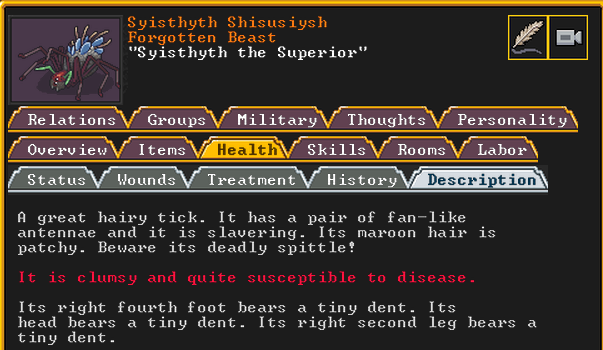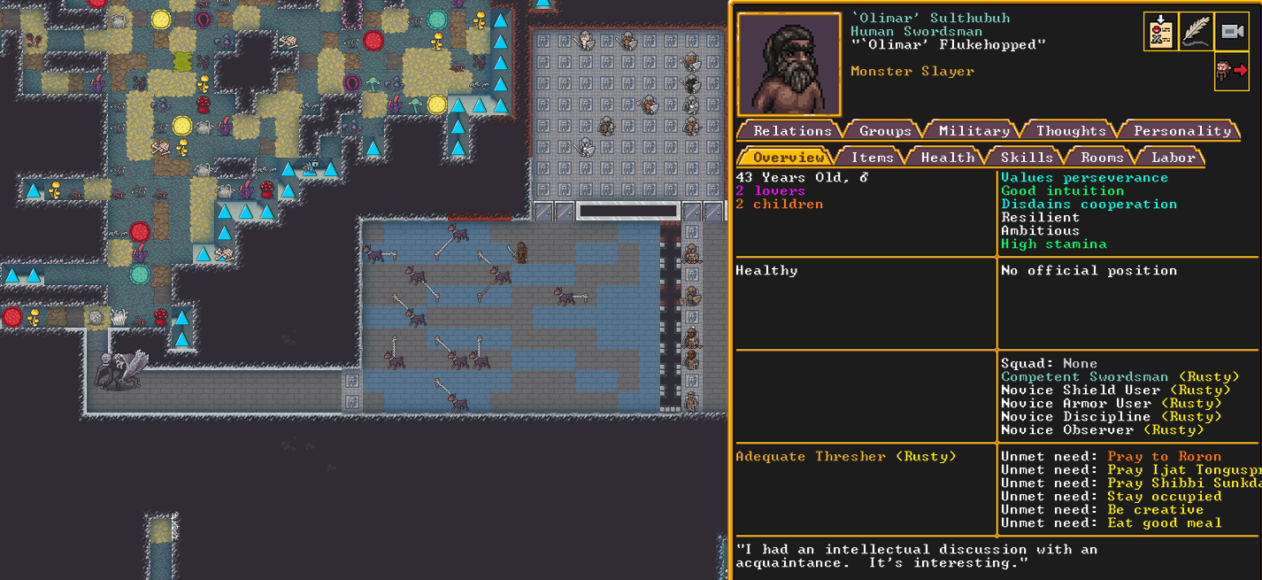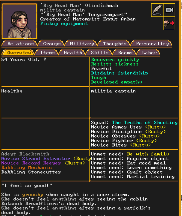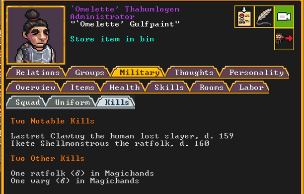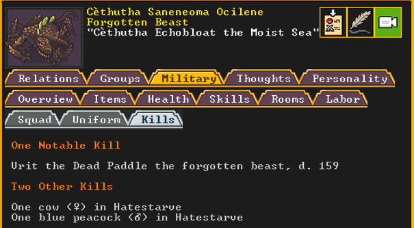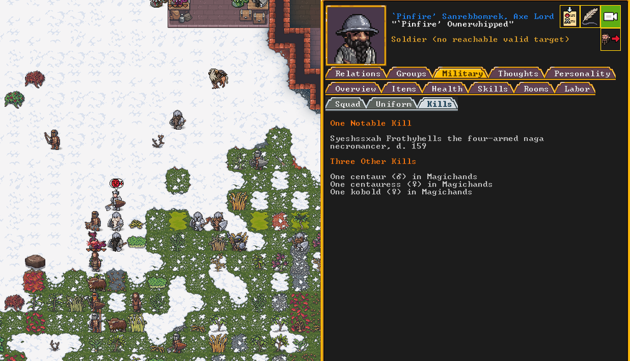 Autumn 161: Lisa Simpson, a kobold poet, was caught up by the horde and killed. Our second militia captain, Big Head Man, is leader of the reserve forces as punishment for stealing. He is a proficient swordsdwarf now. He wields the legendary artifact blade Nishgusil Edankol (Tradedcopper the Stirred Wheel).