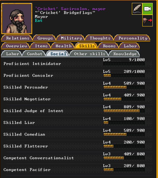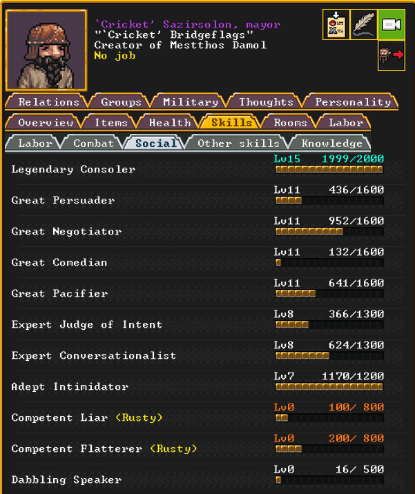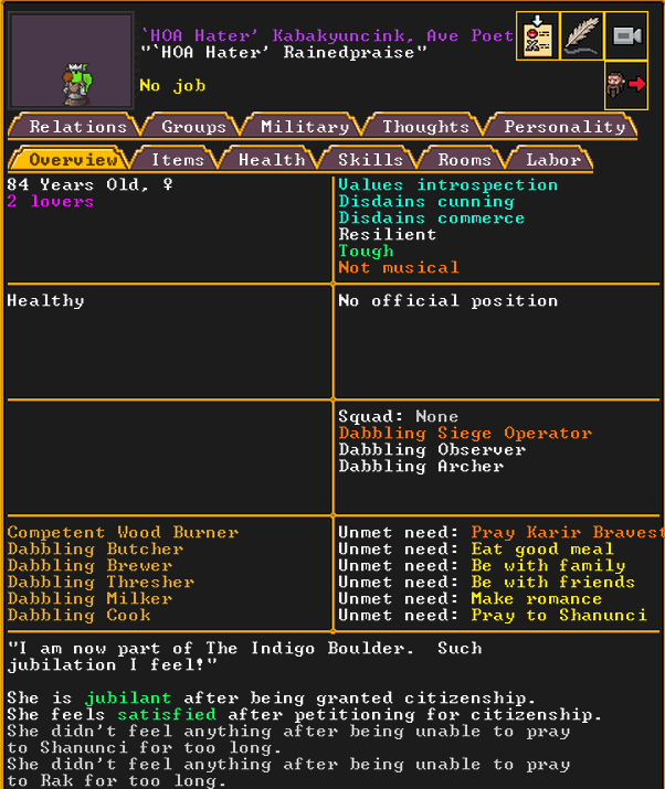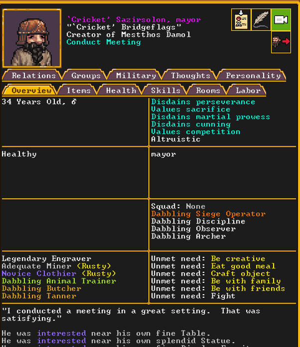 Summer 154: Cricket, a trader, was elected to be our first mayor. He is young, but very social, and is a proficient intimidator and consoler, as well as a skilled persuader, negotiator, and more. We will need to build him specialized living quarters.