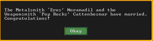 Spring 161: WOAH OUR FIRST WEDDING! And it is Pop Rocks and Eros, joined in holy matrimony. They both felt love while getting married, and had a quiet, private exchanging of vows in the weaponsmith guildhall in their suite together. How romantic..