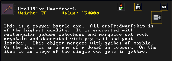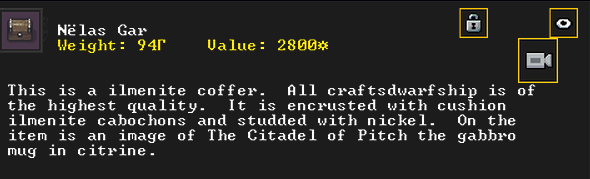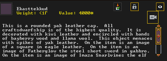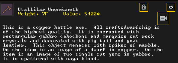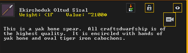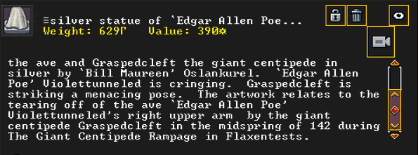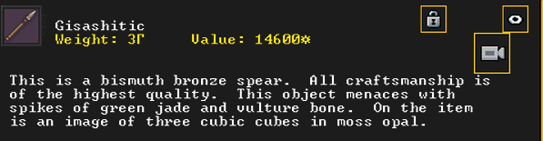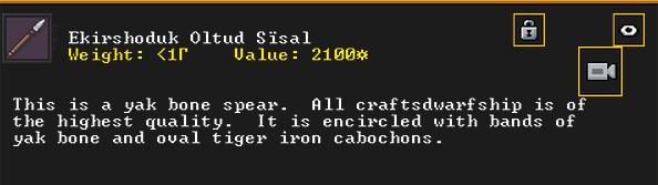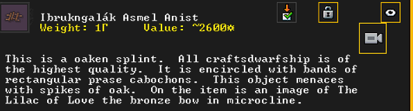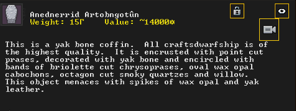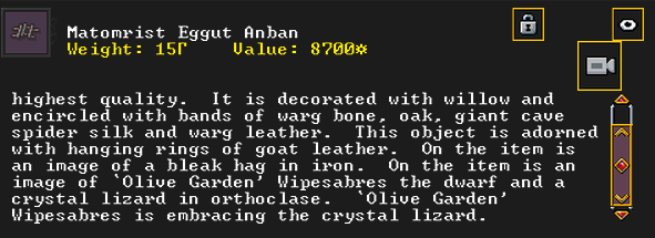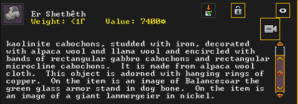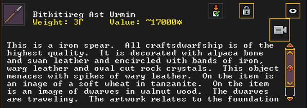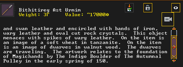 Autumn 161: Ah shit, the thieves made off with our artifacts on display in the tavern. Er Shetbeth (The Fat of Twinkling), an alpaca wool tunic has been gone for a while, but Ekirshoduk Oltud Sisal (Luciddives the Stalker of Gallows) the bone spear is also missing. We placed Tholumer Desgir Dakost (Deepblushes the Goad of Floors), Kinaoncak (Forkednose), and Usithshislug (Grimmuddled) on display instead.