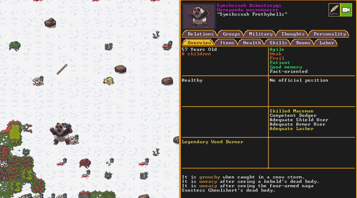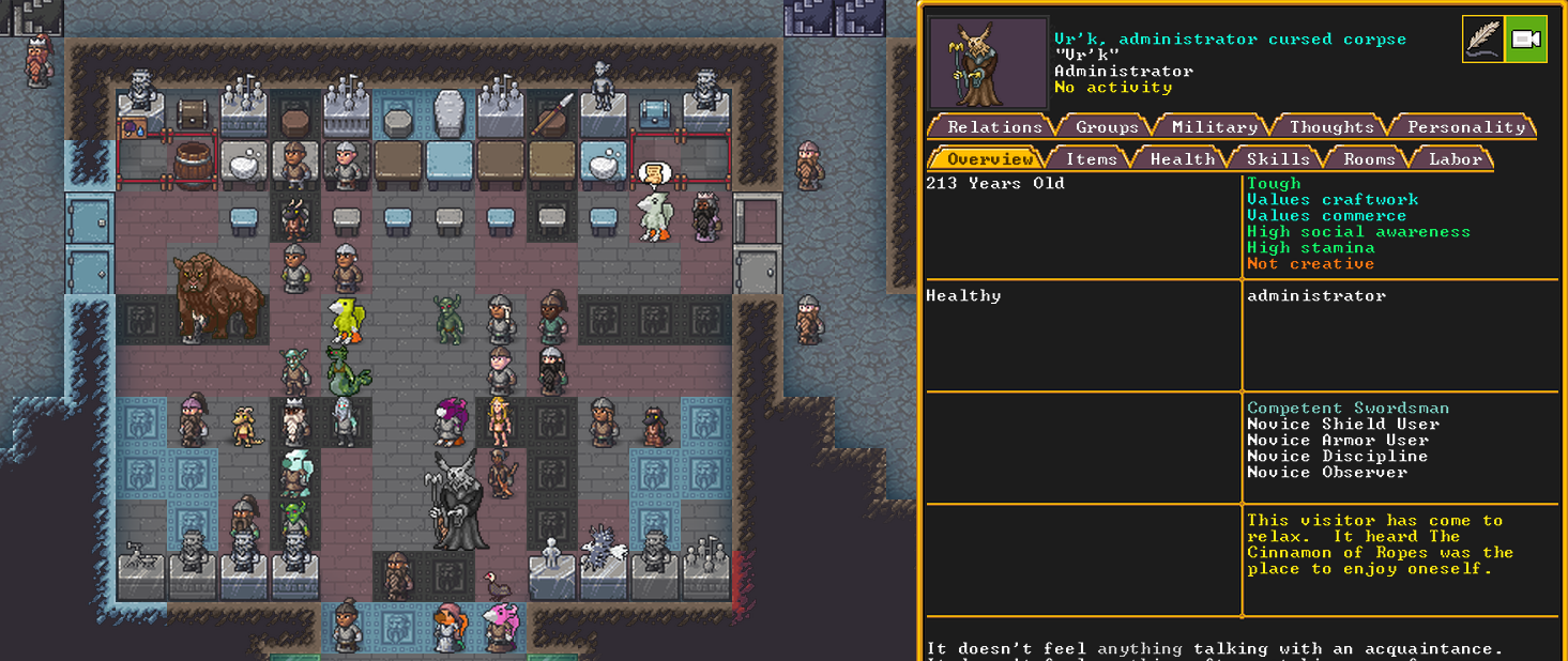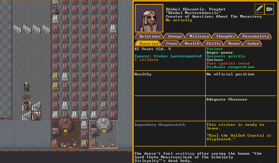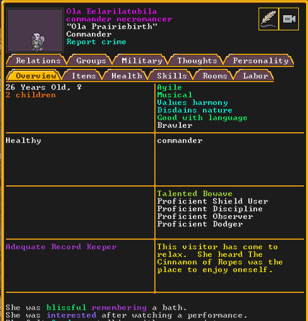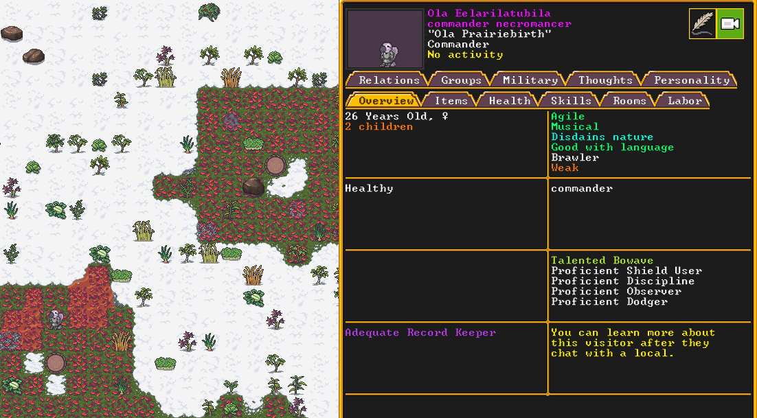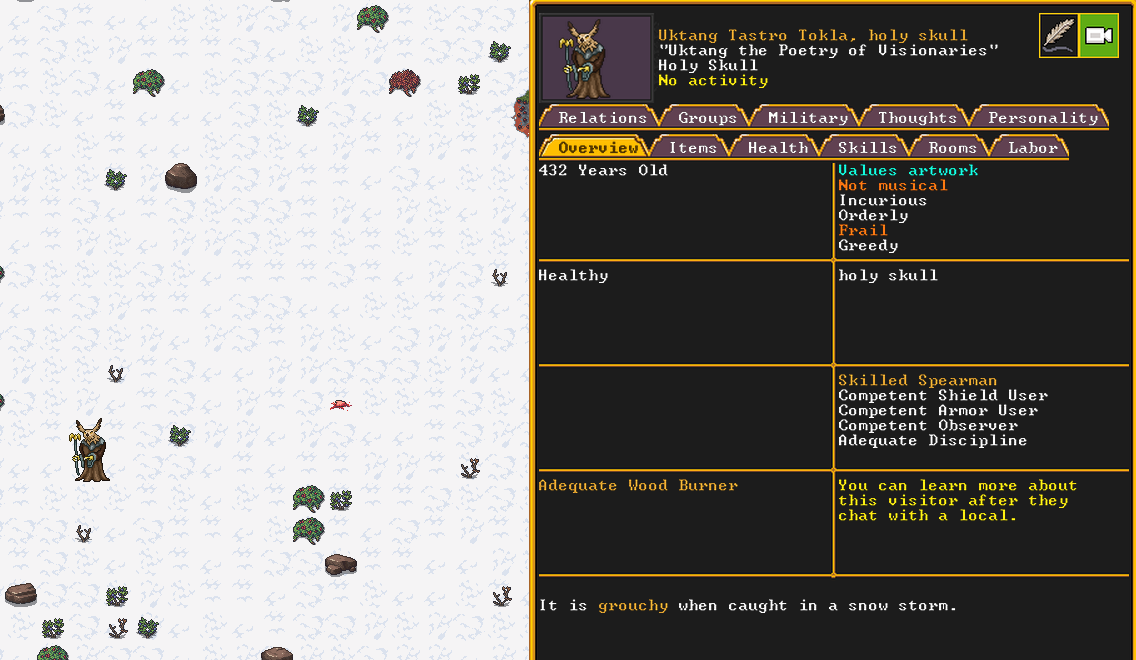 Winter 152: The festival ends, and with a sobering quality, we receive a most ominous visitor. The commander necromancer Ola Prariebirth has come to tour our fortress. The expedition leader Lemon Drop prepares to greet them amicably. Ola is a scholar and bowave, who helped to discover and chart the path of the moon in the sky. They currently work as a commander for a militia group under a Naga civilization. She just scoped out our hospital and then left.