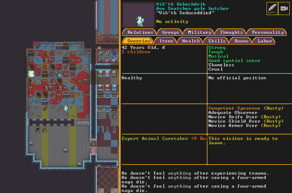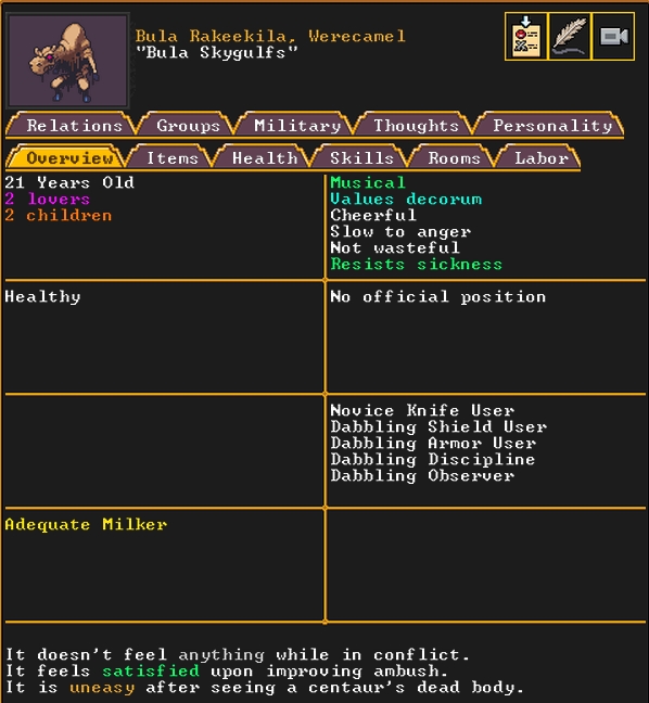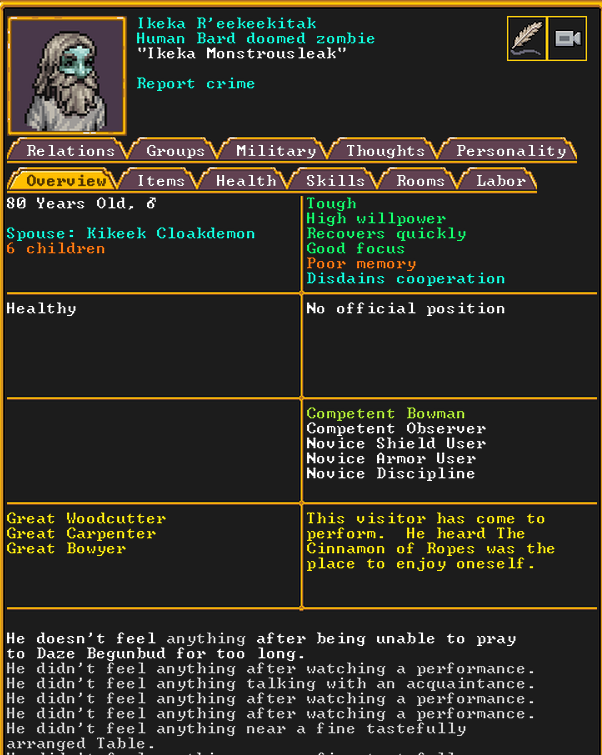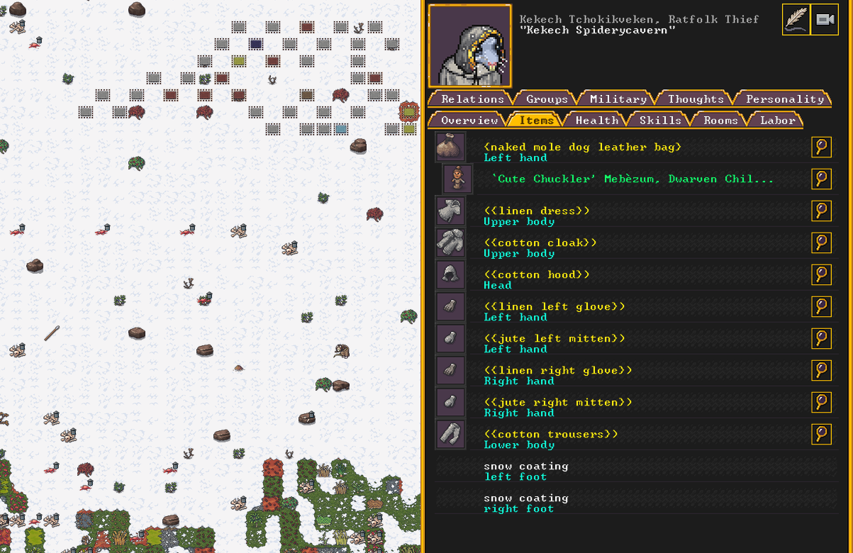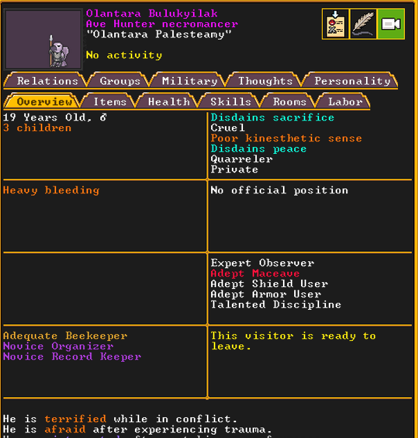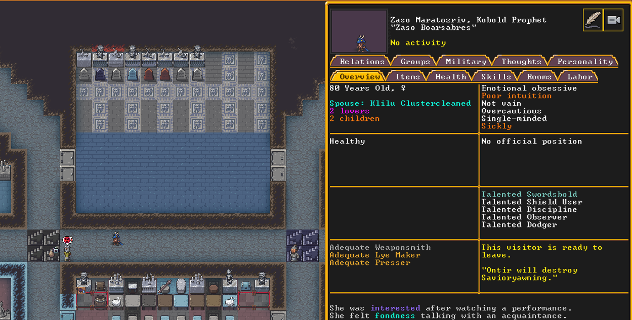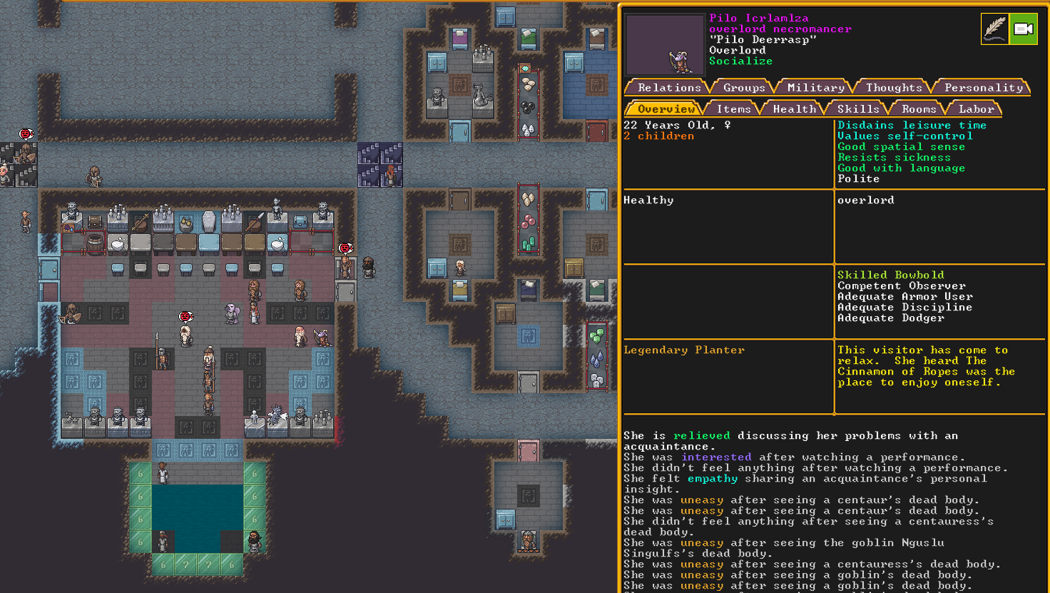 Winter 152: The festival ends, and with a sobering quality, we receive a most ominous visitor. The commander necromancer Ola Prariebirth has come to tour our fortress. The expedition leader Lemon Drop prepares to greet them amicably. Ola is a scholar and bowave, who helped to discover and chart the path of the moon in the sky. They currently work as a commander for a militia group under a Naga civilization. She just scoped out our hospital and then left.