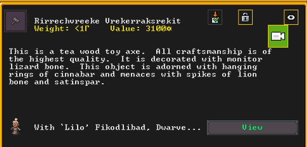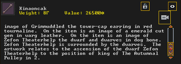 Autumn 161: Limewire, an aven poet, was inspired and created Kinaoncak (Forkednose), a dolomite scepter artifact. She offers it to our group. It shows an image of a tower cap earring artifact, Grimmuddled, which was made in our fortress. It also depicts our second ruler, Zefon Theaterhelp rising to power in the year 2.