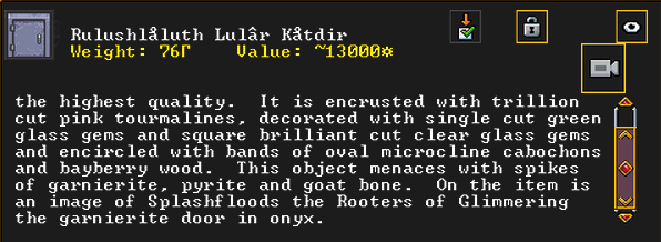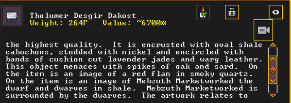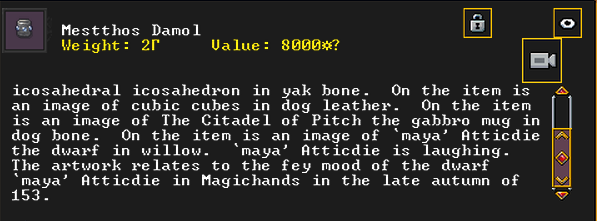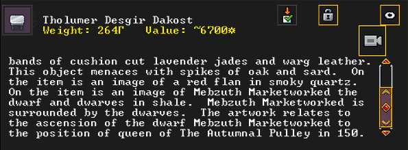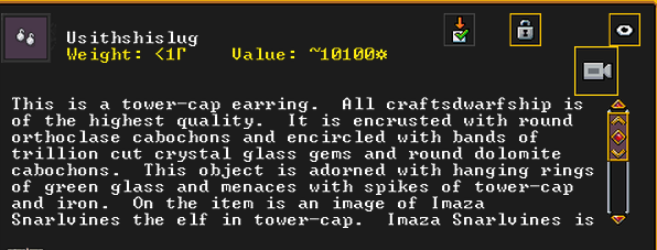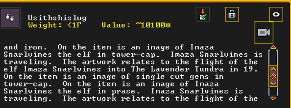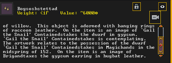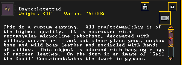 Autumn 154: Liam the gelder created Bogsoshstettad (Brigandtaxes), a gypsum earring. She offers it to the Indigo Boulder. It is decorated with some gemstones, and is adorned with racoon leather. It features an image of the dwarf Gail the Snail, contemplating her possession. It is also recursive, and shows itself.