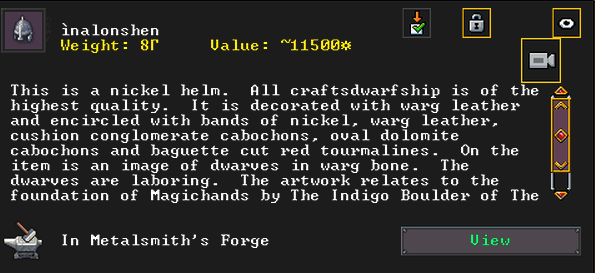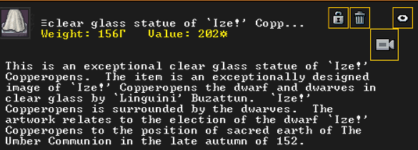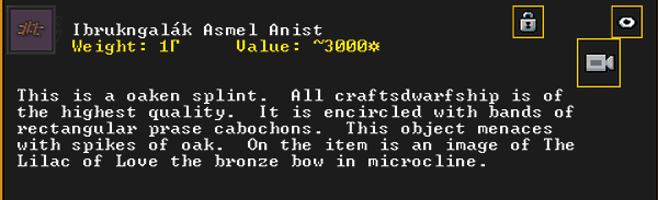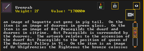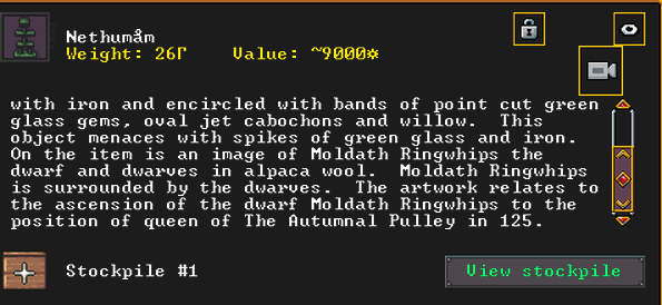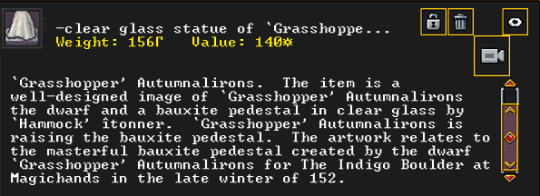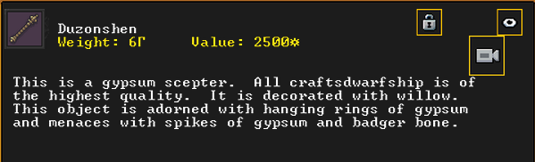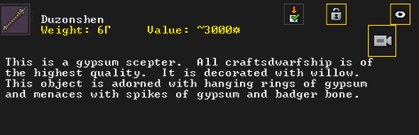Summer 153: Grasshopper the stoneworker was inspired and created Duzonshen (Smearchants), a gypsum scepter artifact. He claims it as a family heirloom. Grasshopper is another one of our founding dwarves, so this development is quite exciting.