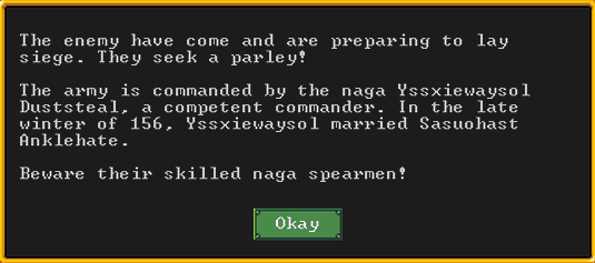 Autumn 161: The enemy has come, a naga army seeking a parley, otherwise they will levy a siege. They are commanded by Arprl Braidchoked, a competent commander. They have armored naga spearmen and war umber hulks. They also have some war opossum. We prepare for a defense.