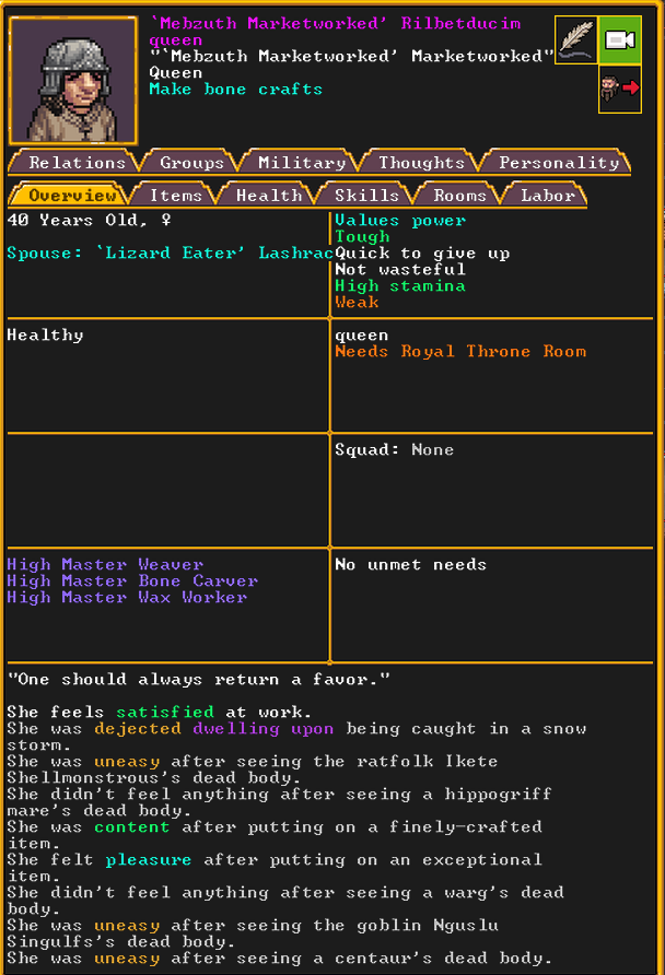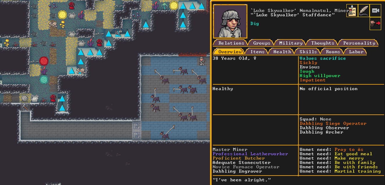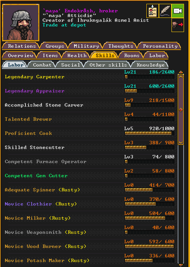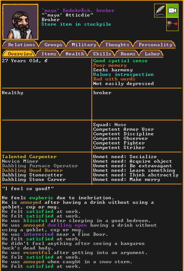 Autumn 151: The dwarven caravan just arrived. We are going to send out a representative to trade, and hopefully encourage more settlers to come. Maya the bone doctor was elected to be our broker. Maya is a talented carpenter and novice miner,