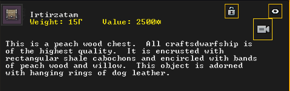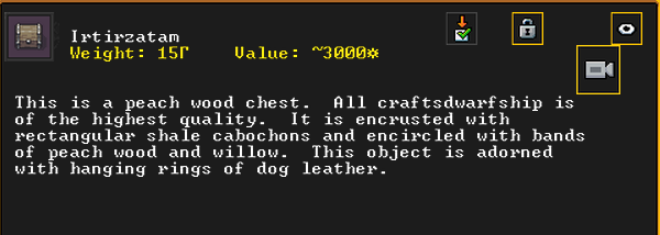 Autumn 152: Blingus, a dwarven dyer, was inspired and created Irtirzatam (Dangledclouts), a peach wood chest artifact. She offers it to our little hamlet.