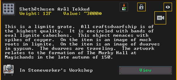 Winter 152: During this momentous time, Appletini the legendary axedwarf and colleague of Brooklyn’s is struck by a strange mood. She claims a stoneworker’s shop. He creates Shetbethusen Aral Tekkud (Twinklehelps the Mightiness of Picks), a lignite grate artifact. She claims it personally as a family heirloom. This great artifact depicts an image of dwarves migrating nad forming The Murky Hall at Magichands in the late autumn of the year 150.
