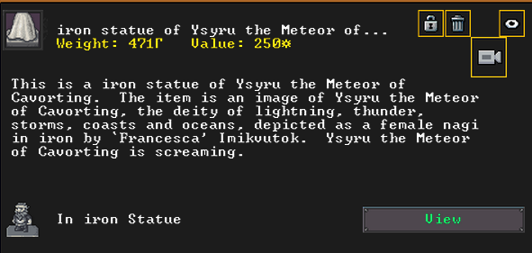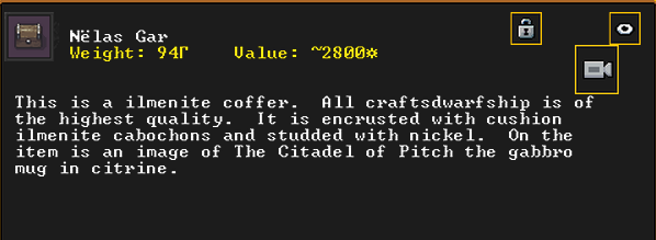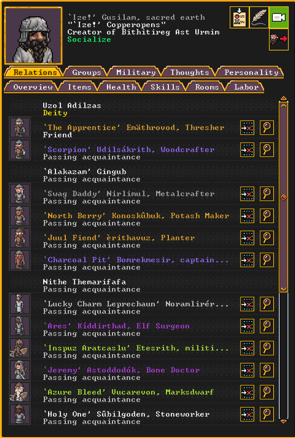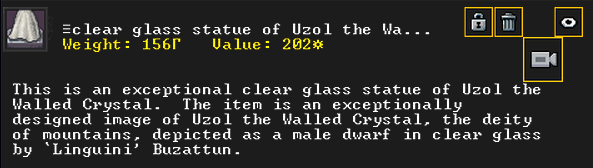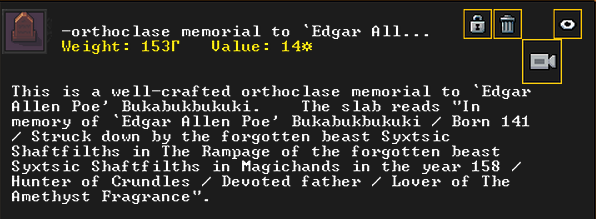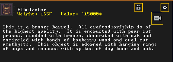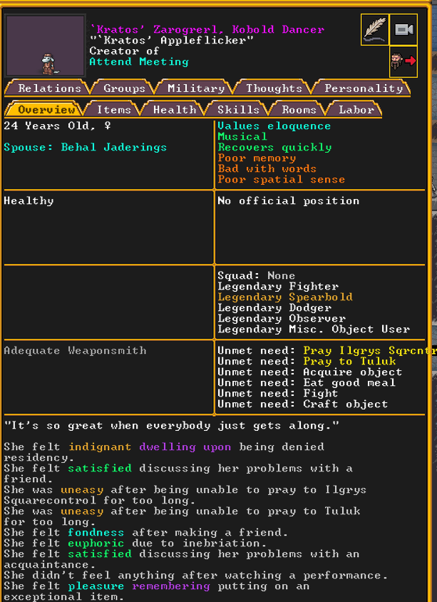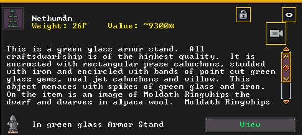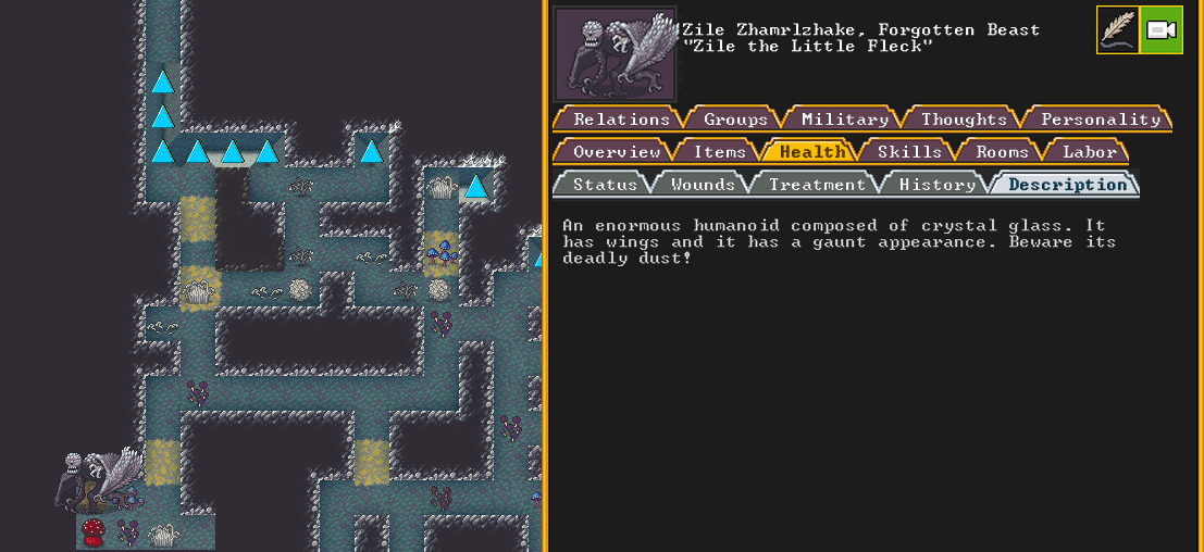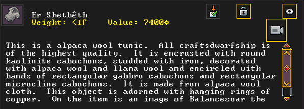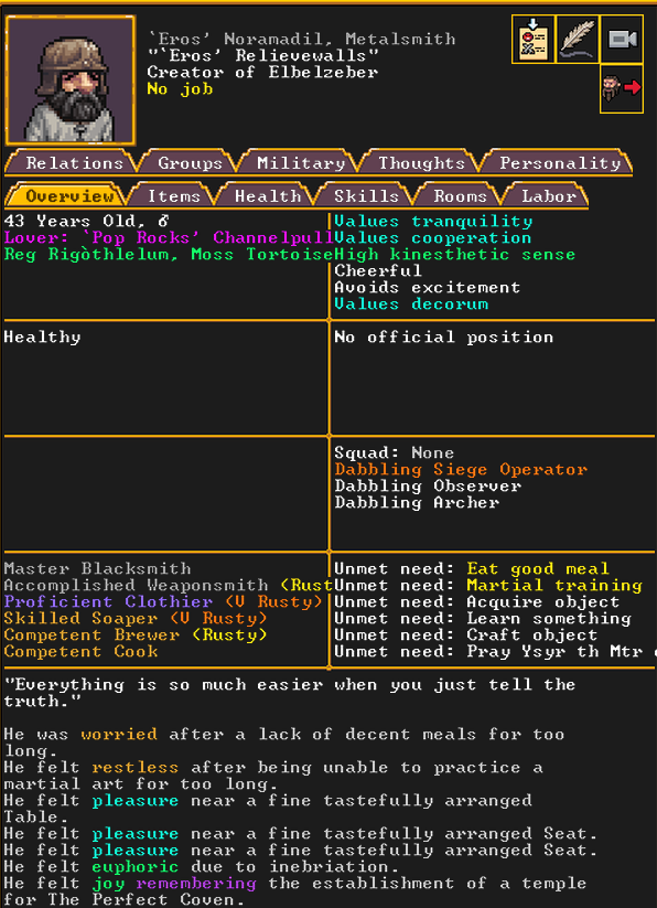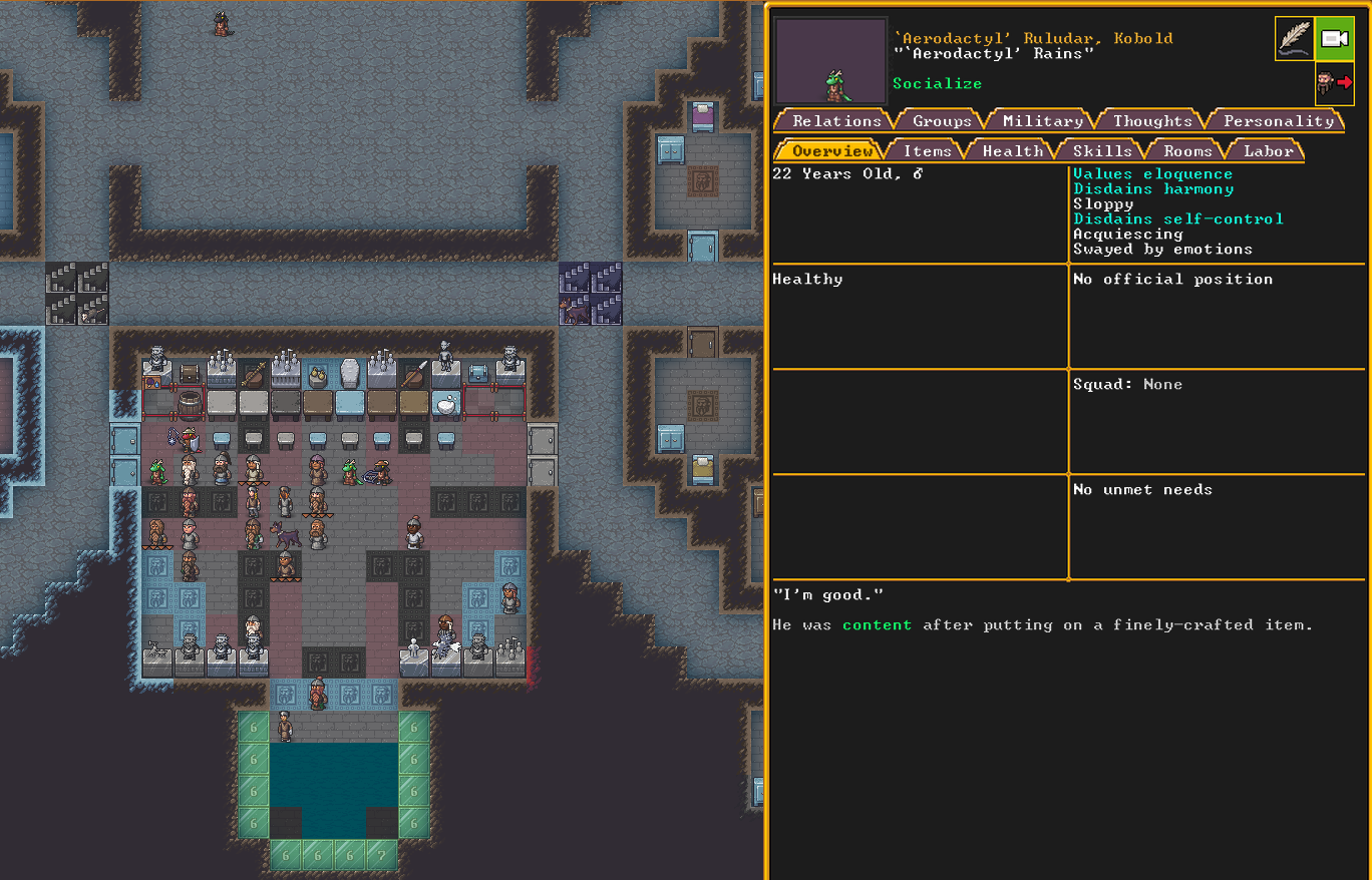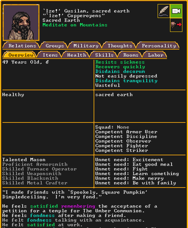 Winter 152: Many of our dwarves are enjoying the new temple that was dedicated to The Umber Communion. This temple is called The Chapel of Amethyst, and those amongst the believers voted to have Ize! be the Sacred Earth of the worshippers. Ize! is a talented mason, proficient armorsmith, and is skilled at furnace operation, weaponsmithing, blacksmithing, and metal crafting. They are a skilled persuader, negotiator, judge of intent, conversationalist, and consoler. His friend in the fortress is Spookely, Square Pumpkin (they very recently became friends while discussing religion in the temple!). He disdains decorum, but is excited that his personalized living quarters and tomb will be completed once the Moonstone Festival ends. He and the rest of the worshippers are dedicated to Uzol Adilzas (Uzol the Walled Crystal).