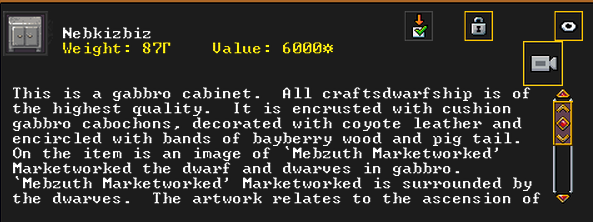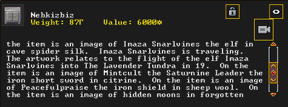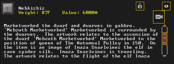 Spring 162: Beard to the Beard, a miner, has created Nebkizbiz (Browndeer), a gabbro cabinet artifact. He offers it to our group. It depicts the ascension of Mebzuth Marketworked to queen in the year 150. It also shows the elf Imaza Snarlvines running into The Lavender Tundra in the year 19. It shows a named iron short sword, Mintcult the Saturnine Leader, as well as the item Peacefulpraise the iron shield. Finally, it shows some hidden moons in forgotten beast bone. After this artifact was created, nature became a little bit brighter and the lands around our fortress seemed to grow verdant.