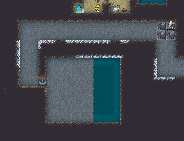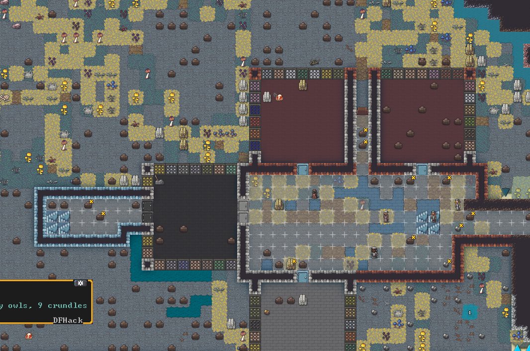 Spring 153: One major flaw of our fortress is a lack of freshwater. Lemon Drop decided that we should funnel water from the cavern into our fortress, and use Twinklehelps the Mightiness of Picks as an indestructible grate to keep any swimmers or forgotten beasts away. We created a well using this design.