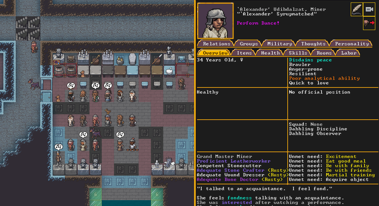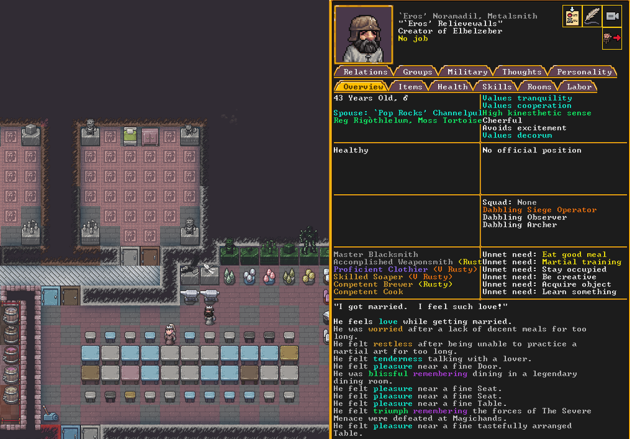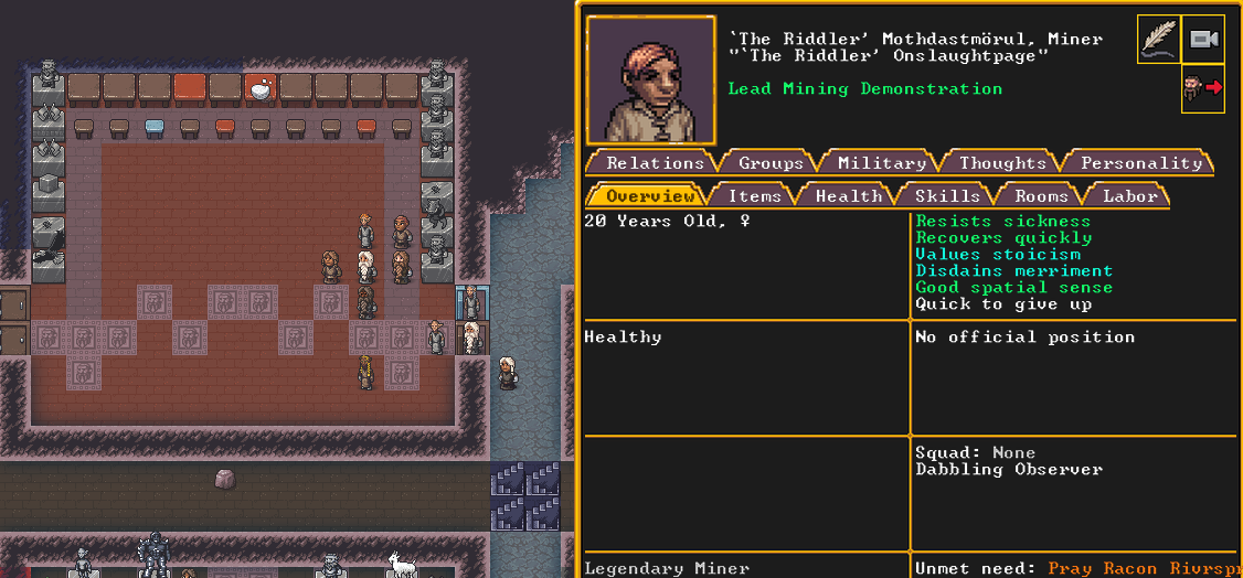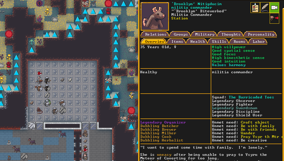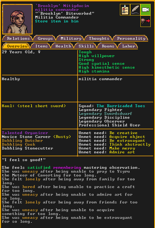 Winter 152: With the first of the month comes the Moonstone Festival, during which our citizens get a well deserved break. All but the most essential of functions are paused, and the militia gets to take some time to relax. Brooklyn, our militia commander and legendary fighter and swordsdwarf, gives an impassioned speech to her new militia recruits about the importance of rest and self care.