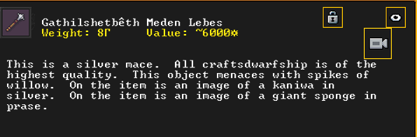 Spring 155: Pop Rocks, a weaponsmith (who came to our fortress from our previous fortress, badly wounded) was inspired and created Gathilshetbeth Meden Lebes (Sensualtwinkles the Tribe of Apexes), a silver mace artifact. She claims it as a family heirloom. We will need to figure out who in her family can wield this powerful weapon. Thus is completed our first of many goals for this fortress!
