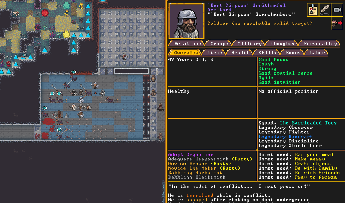 Summer 160: We will need to reform our military squads, so we took this opportunity to revamp our first barracks for our first squad, which was poorly and hastily made. Bart Simpson was elected as our new militia commander. He is well known for three notable kills, including cleaving Zile Depthidols the Little Fleck in two in a single blow. He is a legendary axedwarf and a grand master teacher.