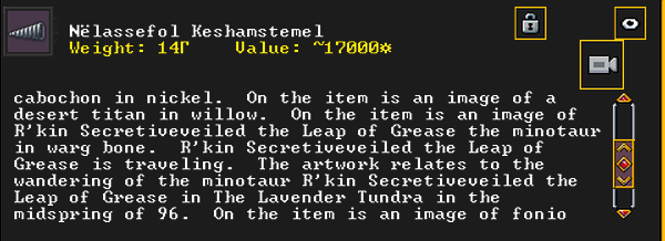 Summer 154: Cricket, our new mayor, was inspired and created Mestthos Damol (The Citadel of Pitch), a gabbro mug artifact. He offers it to our group, like a true mayor should. This item is beautiful, encrusted with round gabbro cabochons and oval cut tanzanites, and it is recursive, featuring an image of itself on it. It also depicts our broker, Maya, entering into a fey mood in Autumn of 153.