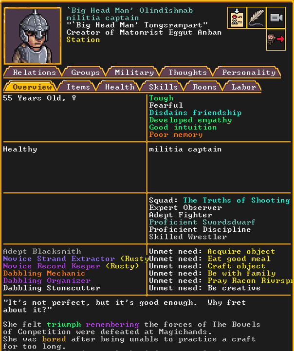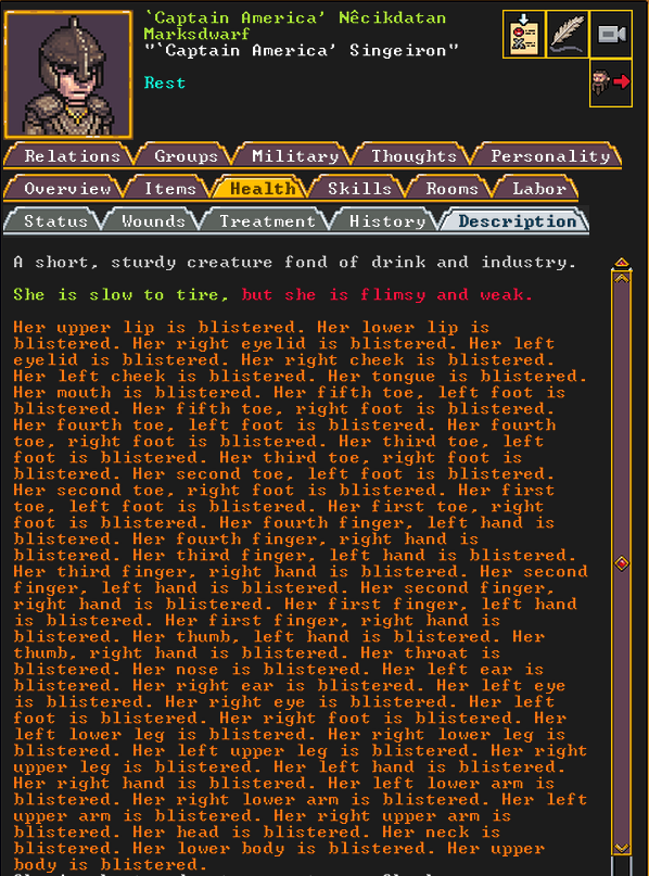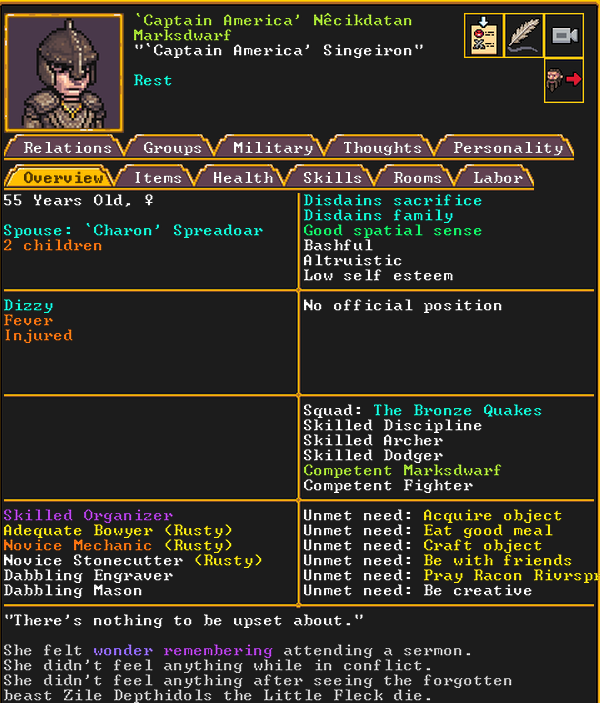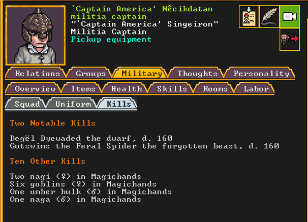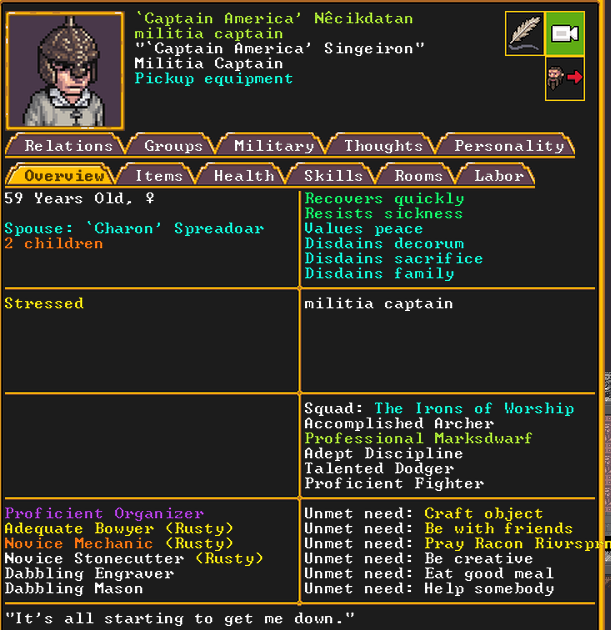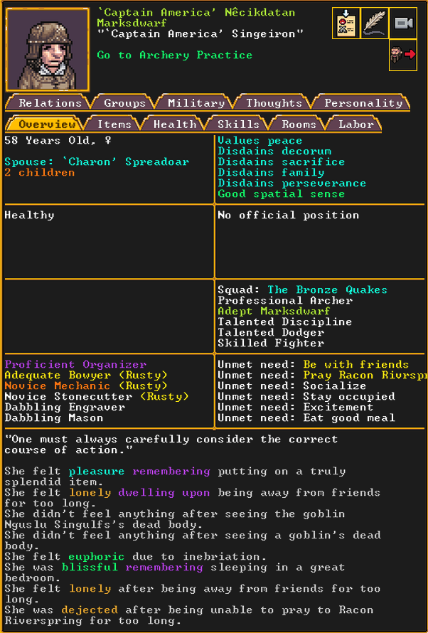 Summer 160: For our marksdwarf squad, we chose Captain America to lead it. As the mother of Cute Chuckler, she is highly motivated to get revenge on those who captured her child, and to keep Lilo safe. Her deadbeat husband, Charon, was returned to our fortress by force after we took over Confuseplague, where he was living. She is a professional marksdwarf and is well-acclaimed.