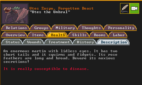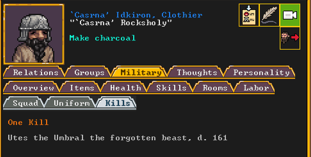 Winter 161: Utes the Umbral somehow made it into our fortress. I missed the action, but it appears that some of our miners were present and took the monster down. Casrna, a clothier, went right back to work burning wood for charcoal after the beast was killed. It isn’t clear how the beast made their way into our fortress.