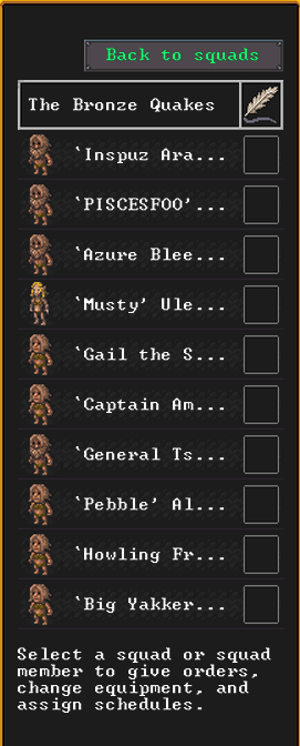 Winter 154: We have created a marksdwarf squad, led by Inspuz Aratcaslu, and featuring many of our newer migrants. However, Musty the elven miner was also inspired to take up military service, and joined too.