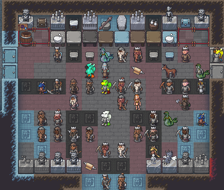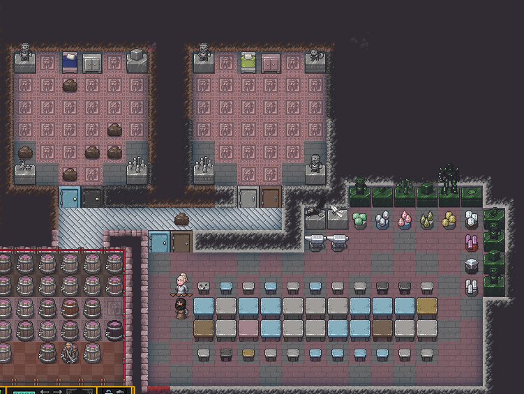 Summer 152: We finally finished our dining room! It is just off center of the main crafts-room, so we can have our citizens access it easily. It also serves as the place of storage for all our finished food items. It is a little plain for now, but we will spruce it up.