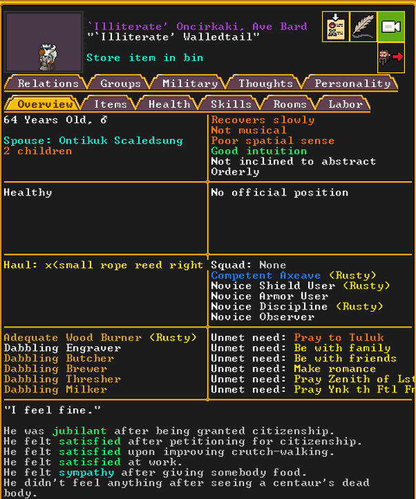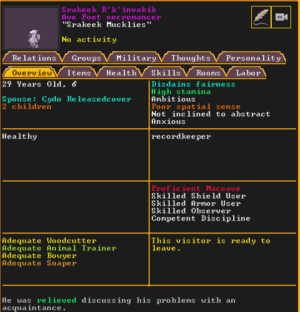 Summer 162: Stan petitioned to join our fortress as a permanent citizen, which was accepted. They are an aven poet.