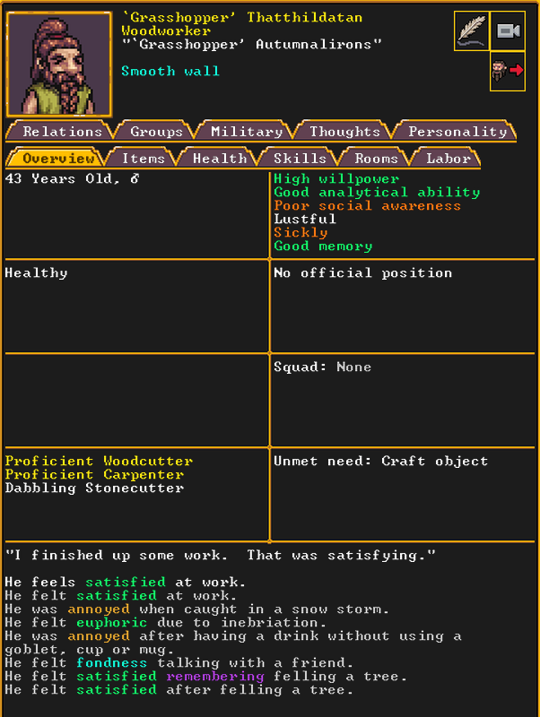 Autumn 150: Grasshopper is a woodcutter and carpenter, who is pretty flexible and is quite happy to be smoothing some walls of our fortress right now.