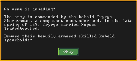 Winter 161: Far too soon, a kobold force has come to invade us. They are led by Tryrge Shrewoman, a competent commander. Their crowning achievement was getting married in 159.