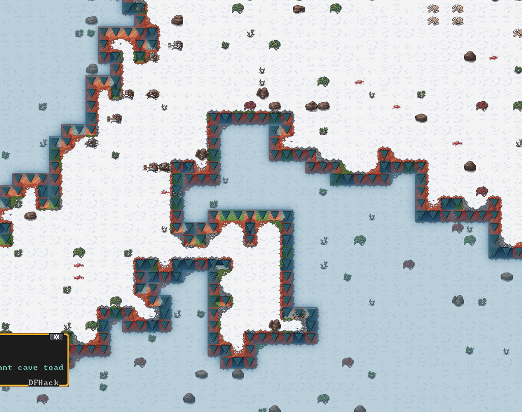 Winter 162: Two forgotten beasts are fighting right outside of our fortress. Zimun Carnagedied, on the left, is a great one-eyed eight-legged iguana. It has ecru scales and a deadly spittle attack. Yula, on the left, is a towering hairy nematode beast with a pale blue hair and web attack. It appears that Zimun is losing this battle.
