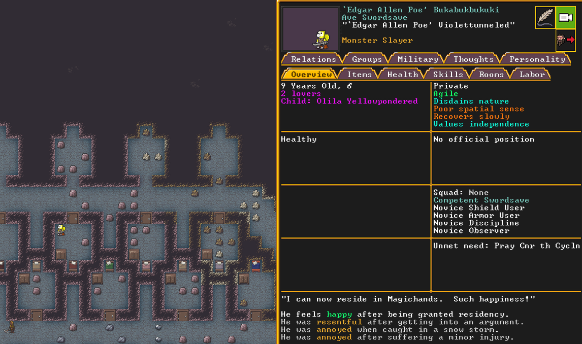 Summer 151: Our citizens are extremely busy building the essentials for us. We had a new addition to our fortress, a monster slayer called Edgar Allen Poe. He will hopefully help our militia if there are any monster attacks.