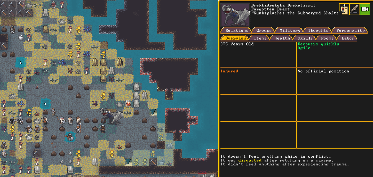 Autumn 160: With the beasts dead, we begin our project to build the Queen’s quarters jutting into the caverns. Unfortunately, as we began, a final beast flew in from hiding - Sunksplashes the Submerged Shafts. This is a one-eyed Grebe, a duck like creature with a deadly spittle attack. The beast pecks directly into the brains of the miner Alexander, killing them.